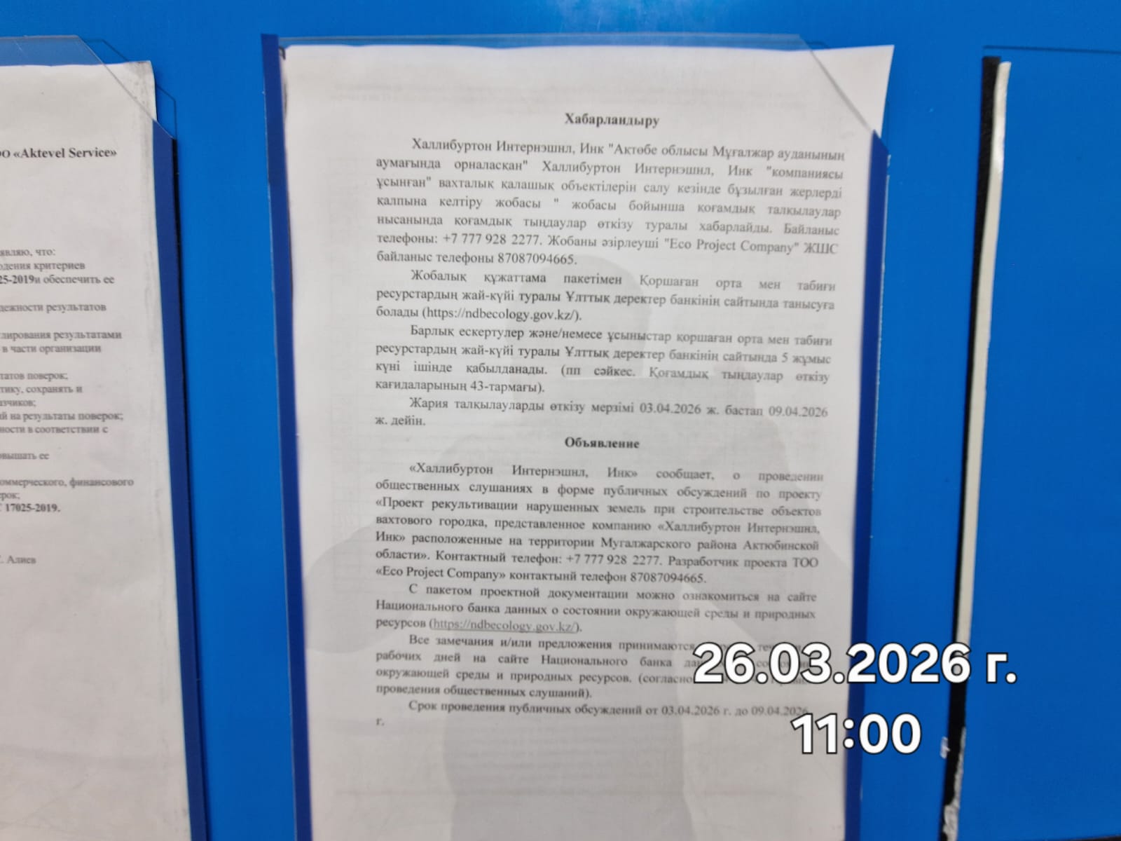 По проекту: Раздел охраны окружающей среды к «Проект рекультивации нарушенных земель при строительстве объектов вахтового городка, представленное компанию «Халлибуртон Интернэшнл, Инк» расположенные на территории Мугалжарского района Актюбинской области»