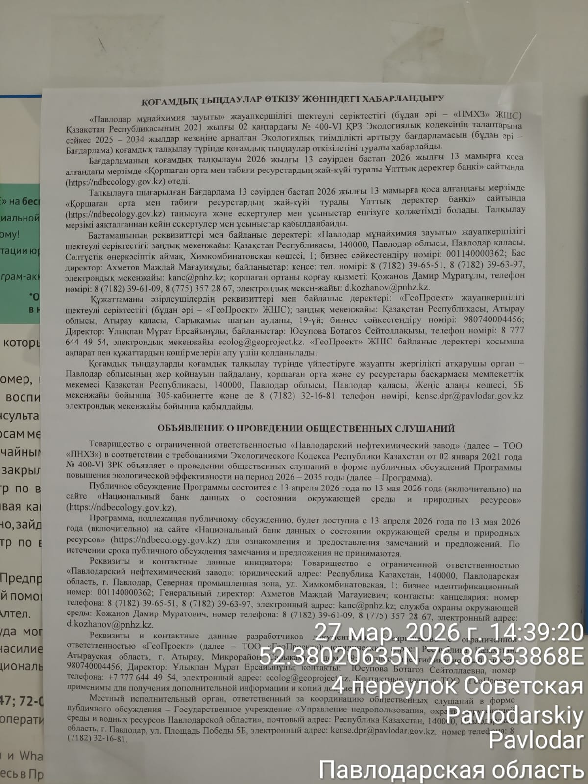 По проекту: Программа повышения экологической эффективности на период 2026 – 2035 годы ТОО "ПНХЗ"