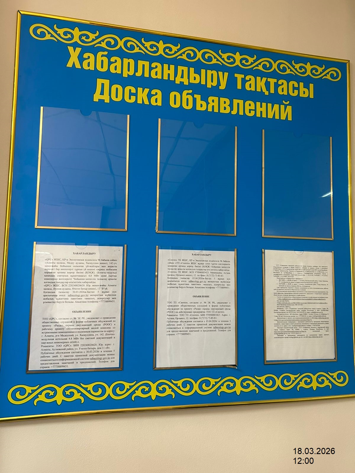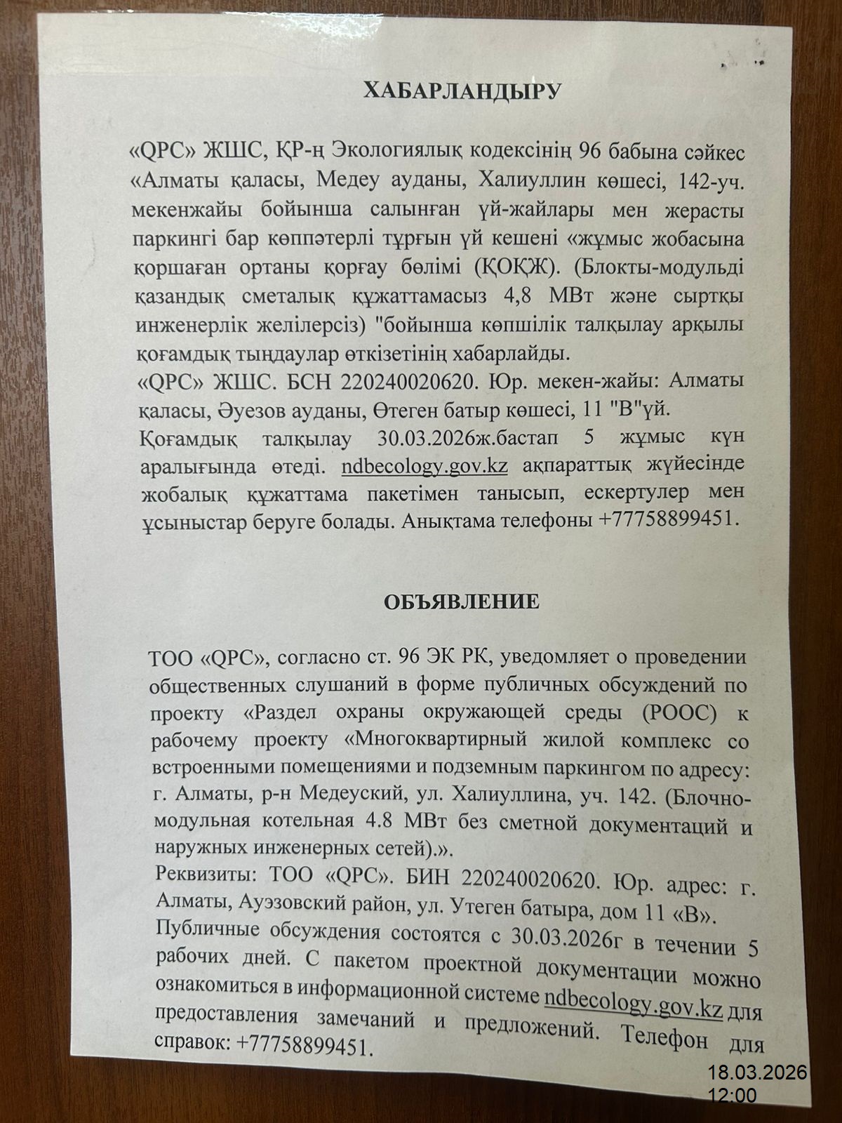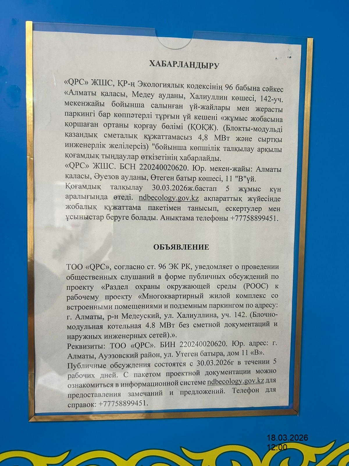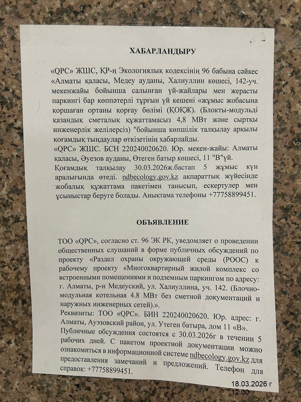 По проекту: РАЗДЕЛ «ОХРАНЫ ОКРУЖАЮЩЕЙ СРЕДЫ» (РООС) к рабочему проекту «Многоквартирный жилой комплекс со встроенными помещениями и подземным паркингом по адресу: г. Алматы, р-н Медеуский, ул. Халиуллина, уч. 142. (Блочно-модульная котельная 4.8 МВт без сметной документаций и наружных инженерных сетей).»