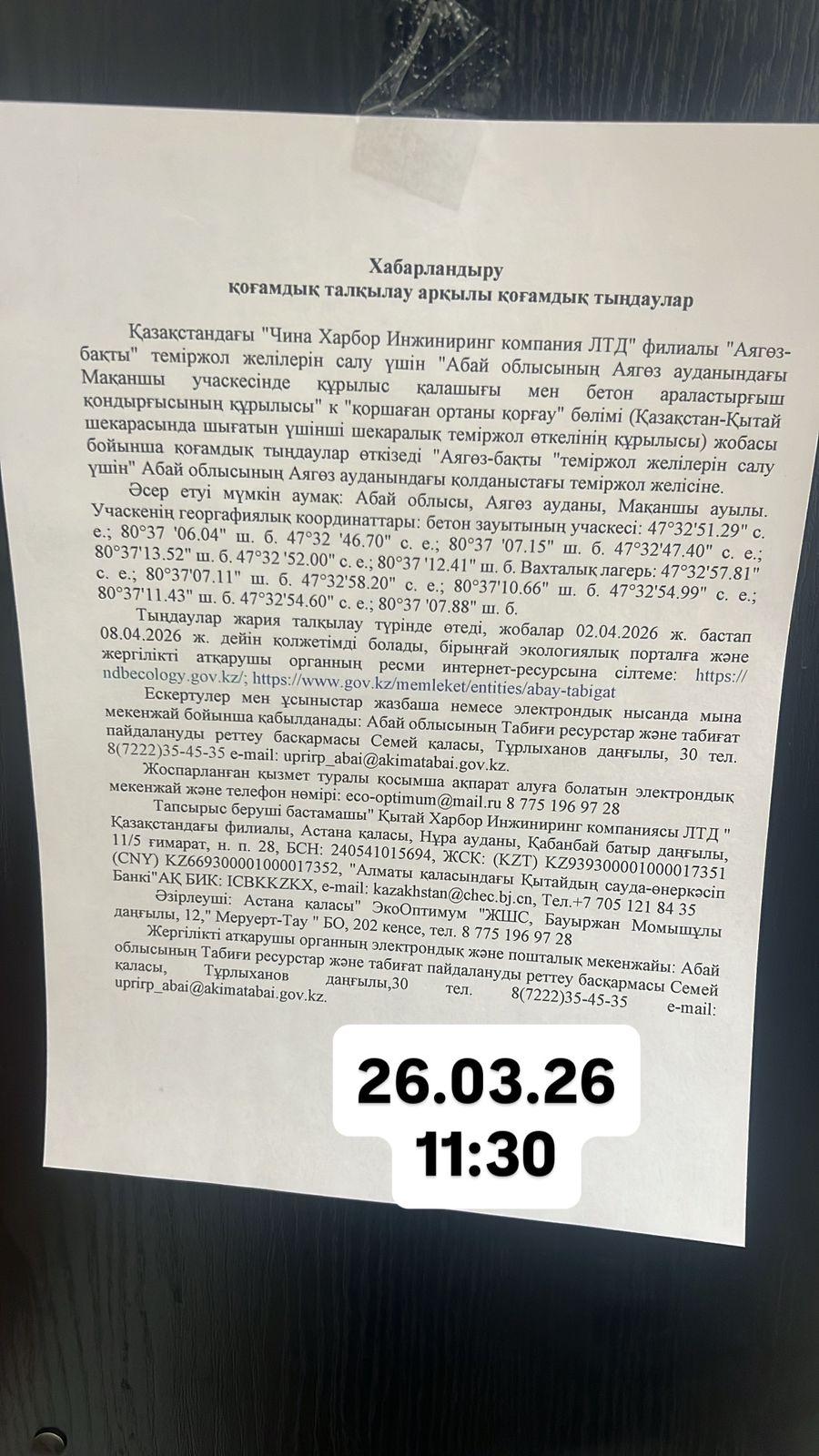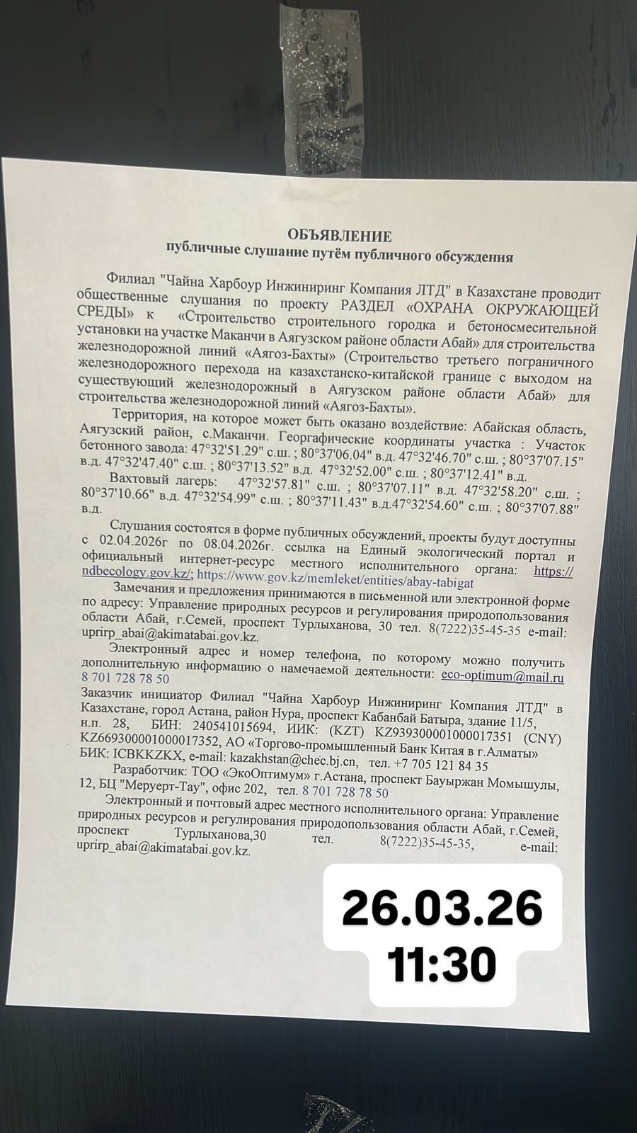 По проекту: «Строительство строительного городка и бетоносмесительной установки на участке Маканчи в районе Маканчи области Абай» для строительства железно-дорожной линий «Аягоз-Бахты» (Строительство третьего пограничного желез-нодорожного перехода на казахстанско-китайской границе с выходом на суще-ствующий железнодорожный участок Семей - Актогай»). Раздел охраны окружающей среды (РООС)