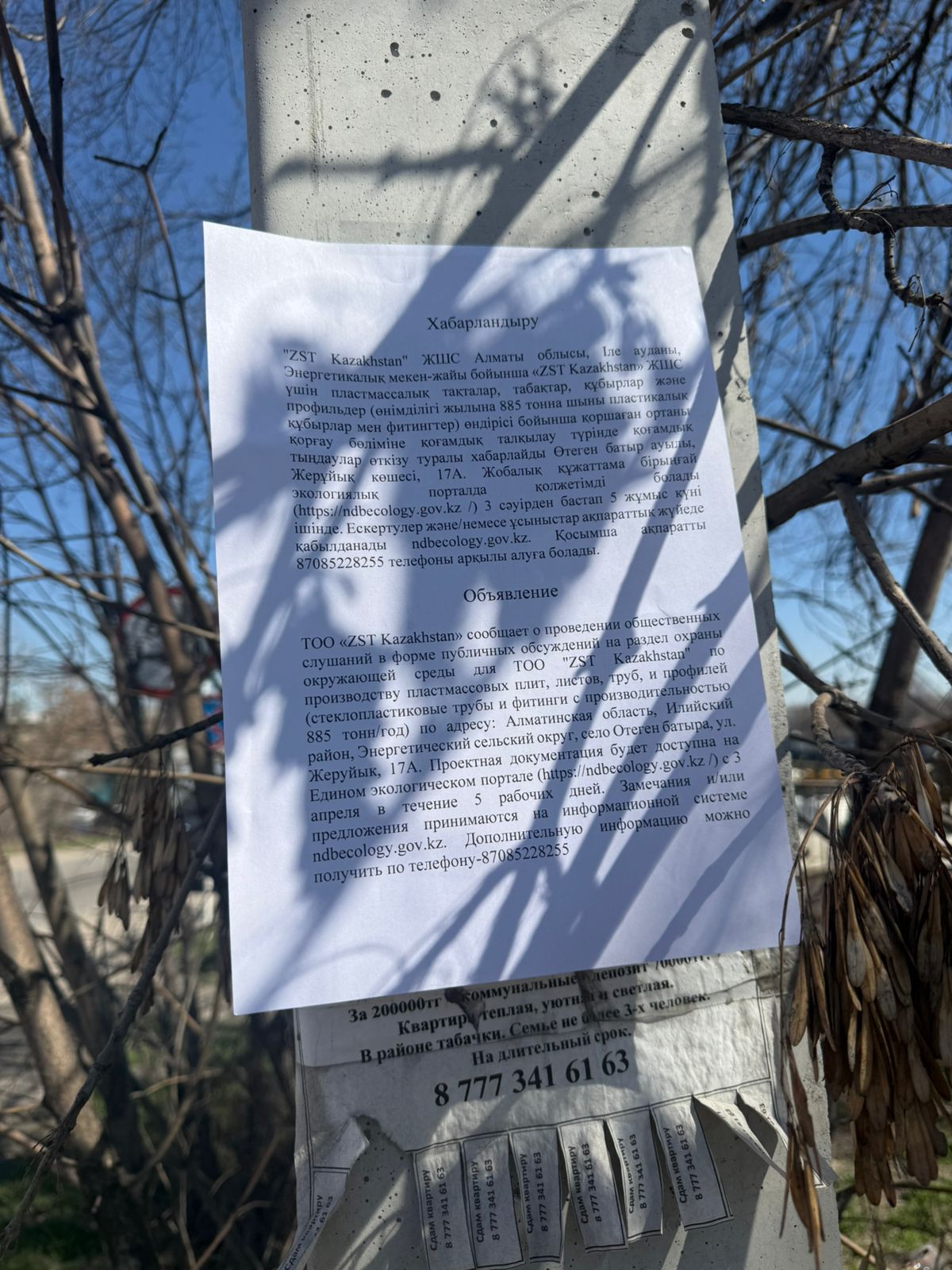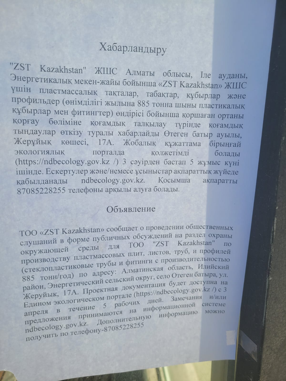 По проекту: Раздел «Охрана окружающей среды» для ТОО "ZST Kazakhstan" по производству пластмассовых плит, листов, труб, и профилей (стеклопластиковые трубы и фитинги с производительностью 885 тонн/год) по адресу: Алматинская область, Илийский район, Энергетический сельский округ, село Отеген батыра, ул. Жеруйык, 17А»
