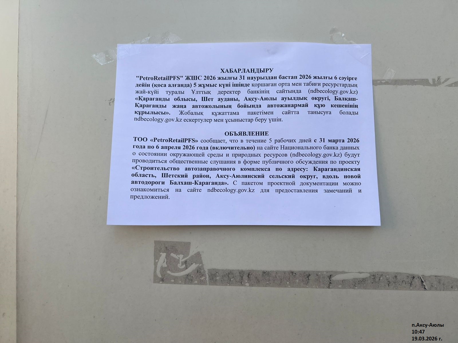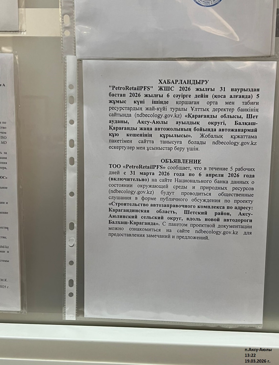 По проекту: «Строительство автозаправочного комплекса по адресу: Карагандинская область, Шетский район, Аксу-Аюлинский сельский округ, вдоль новой автодороги Балхаш-Караганда»