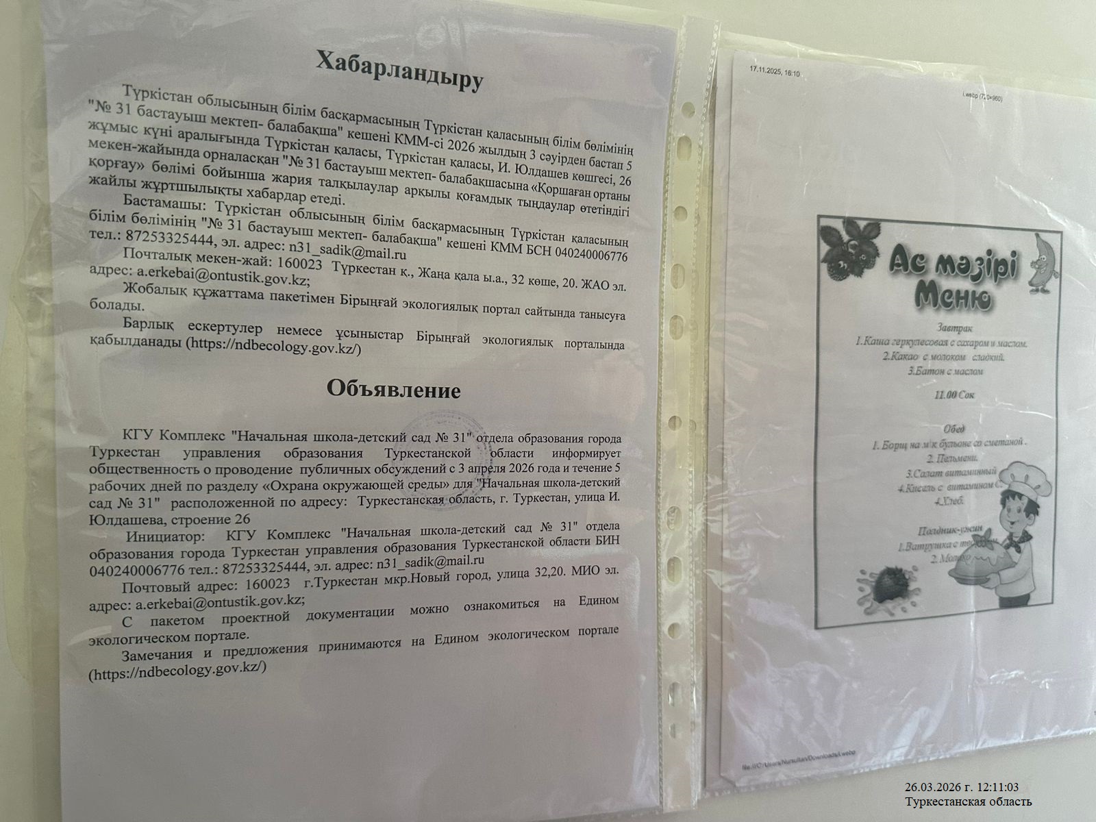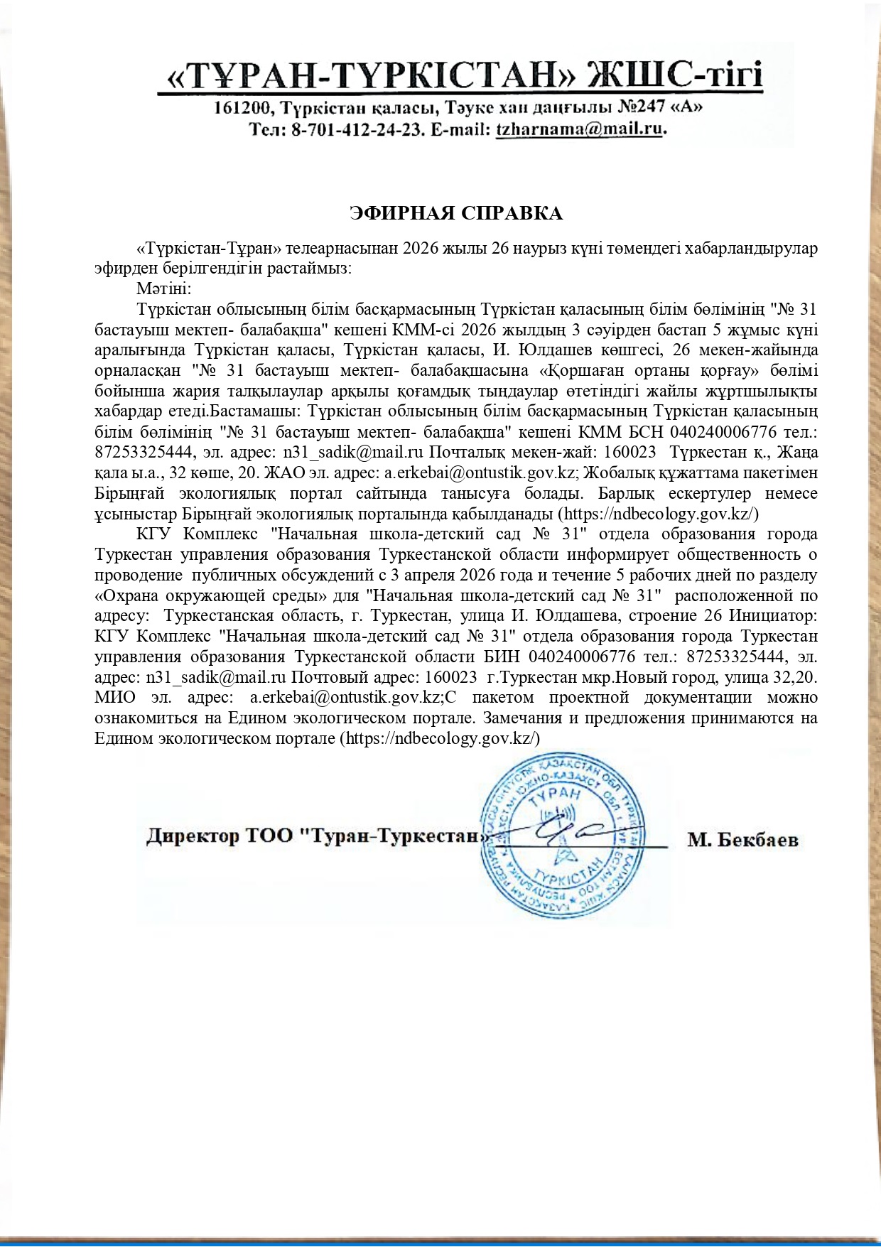 По проекту: РАЗДЕЛ «Охрана окружающей среды» для "Начальная школа-детский сад № 31" расположенной по адресу: Туркестанская область, г. Туркестан, улица И. Юлдашева, строение 26