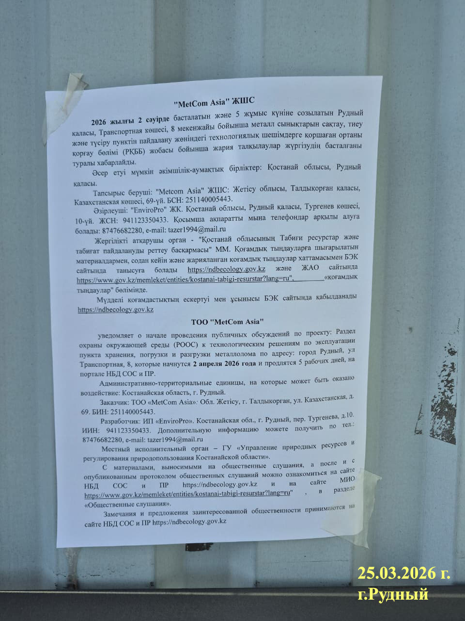 По проекту: Раздел охраны окружающей среды (РООС) к технологическим решениям по эксплуатации пункта хранения, погрузки и разгрузки металлолома по адресу: город Рудный, ул. Транспортная, 8
