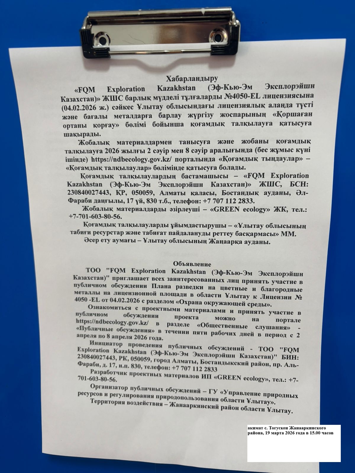1. Инициатор: Товарищество с ограниченной ответственностью ""FQM Exploration Kazakhstan (Эф-Кью-Эм Эксплорэйшн Казахстан)""