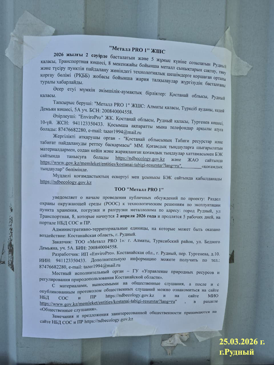 По проекту: Раздел охраны окружающей среды (РООС) к технологическим решениям по эксплуатации пункта хранения, погрузки и разгрузки металлолома по адресу: город Рудный, ул. Транспортная, 8