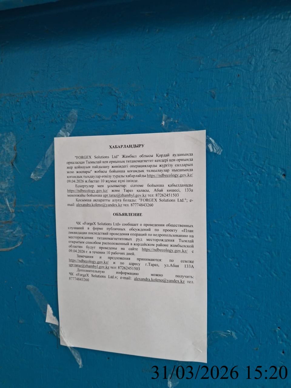 По проекту: ПЛАН ЛИКВИДАЦИИ ПОСЛЕДСТВИЙ ПРОВЕДЕНИЯ ОПЕРАЦИЙ ПО НЕДРОПОЛЬЗОВАНИЮ НА МЕСТОРОЖДЕНИИ ТИТАНОМАГНЕТИТОВЫХ РУД МЕСТОРОЖДЕНИЯ ТЫМЛАЙ ОТКРЫТЫМ СПОСОБОМ РАСПОЛОЖЕННЫЙ В КОРДАЙСКОМ РАЙОНЕ ЖАМБЫЛСКОЙ ОБЛАСТИ