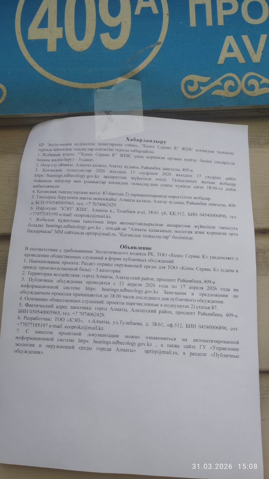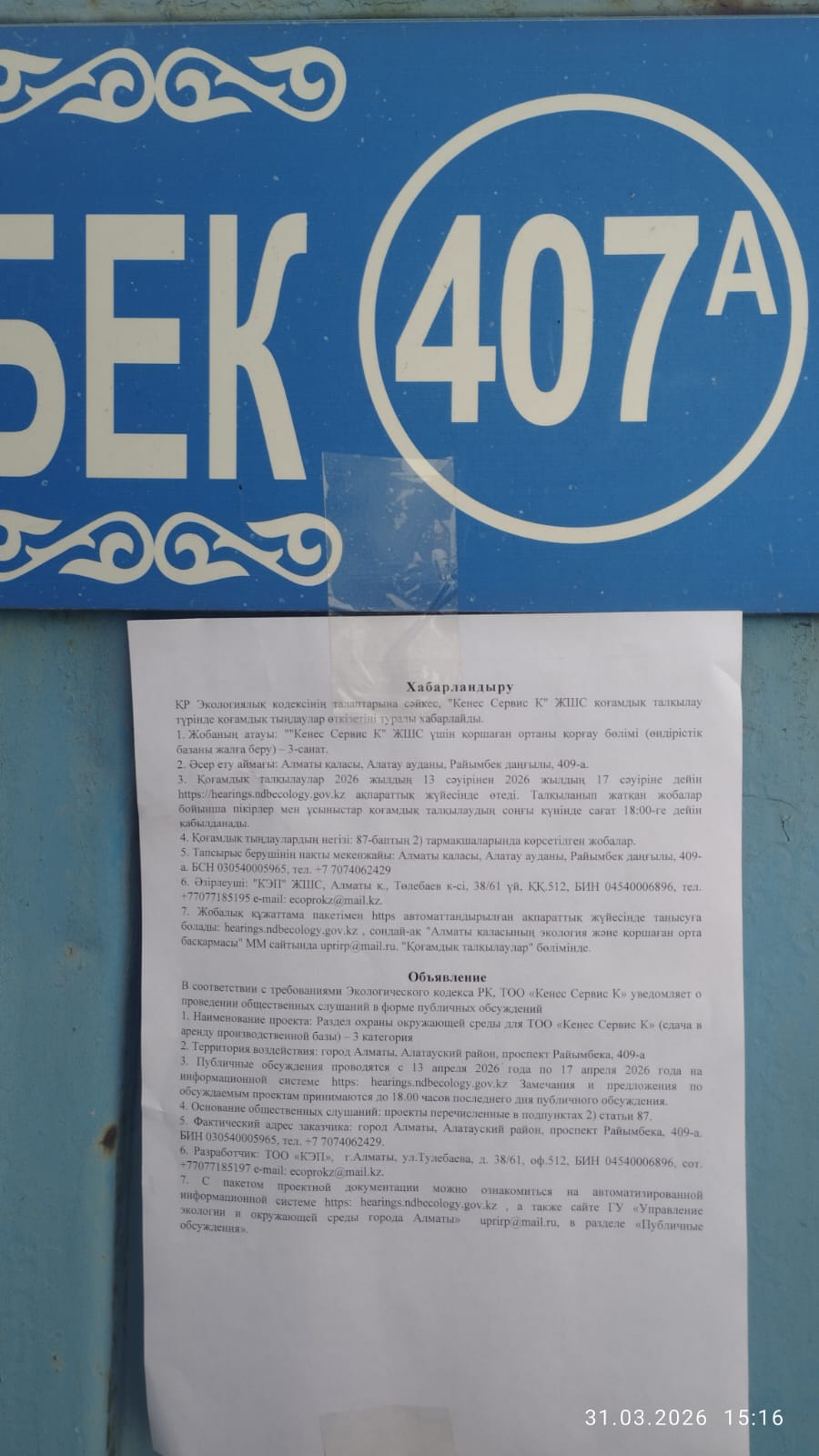 По проекту: Раздел охраны окружающей среды для ТОО «Кенес Сервис К»