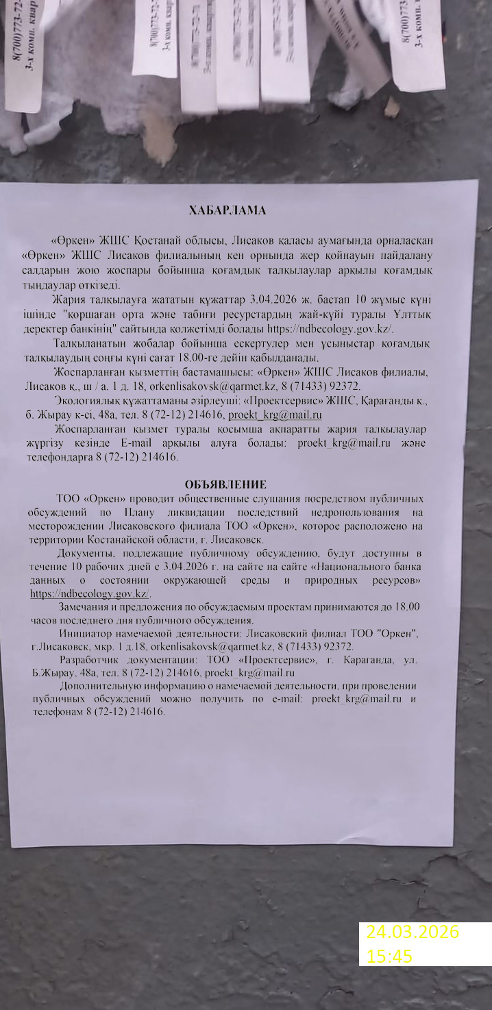 По проекту: План ликвидации последствий недропользования на месторождении Лисаковского филиала ТОО «Оркен»