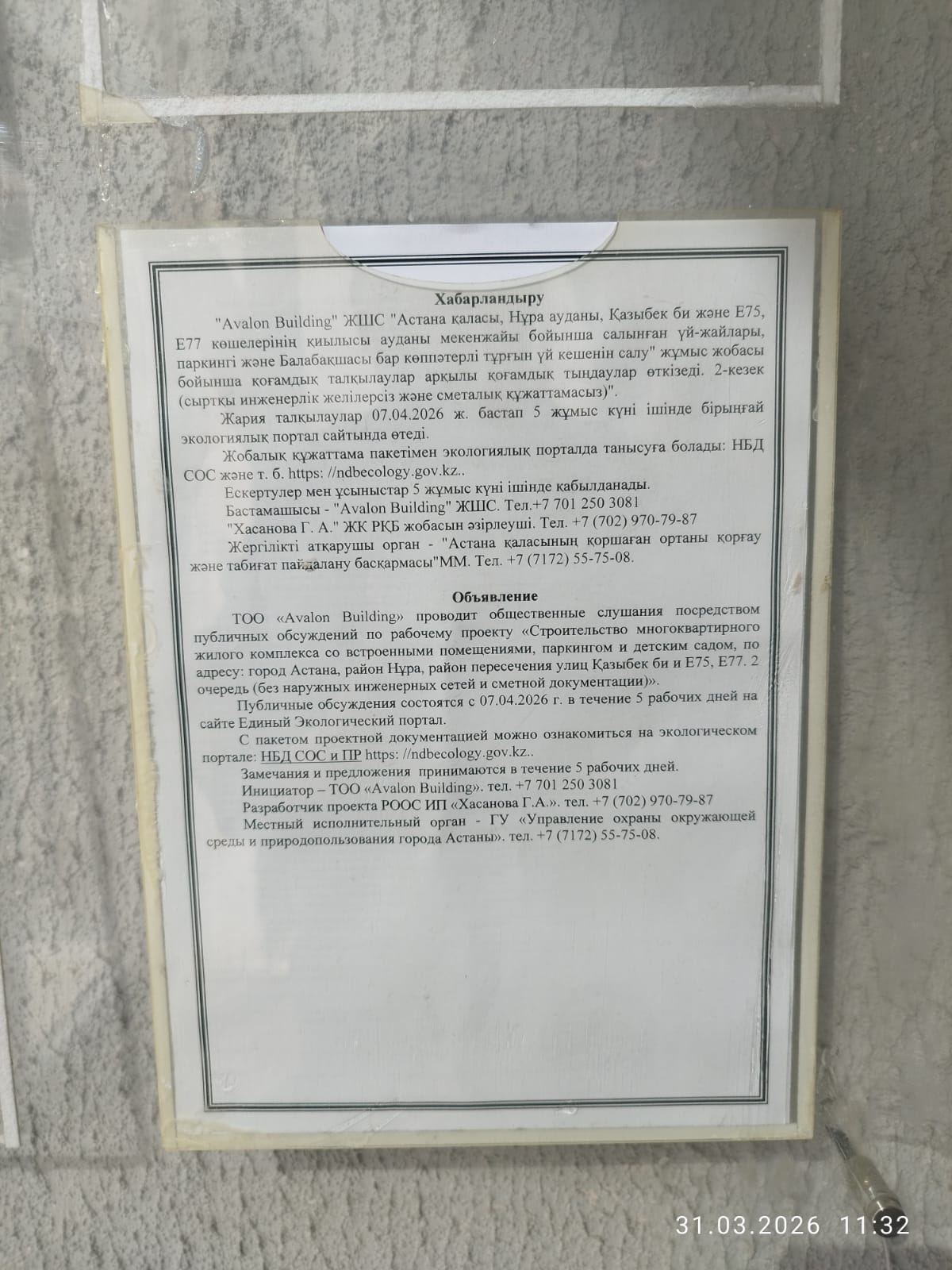 По проекту: РАЗДЕЛ «ОХРАНА ОКРУЖАЮЩЕЙ СРЕДЫ» к рабочему проекту «Строительство многоквартирного жилого комплекса со встроенными помещениями, паркингом и детским садом, по адресу: город Астана, район Нұра, район пересечения улиц Қазыбек би и Е75, Е77. 2 очередь (без наружных инженерных сетей и сметной документации)»