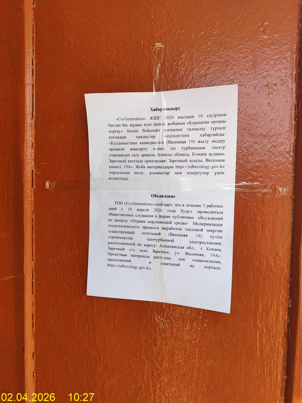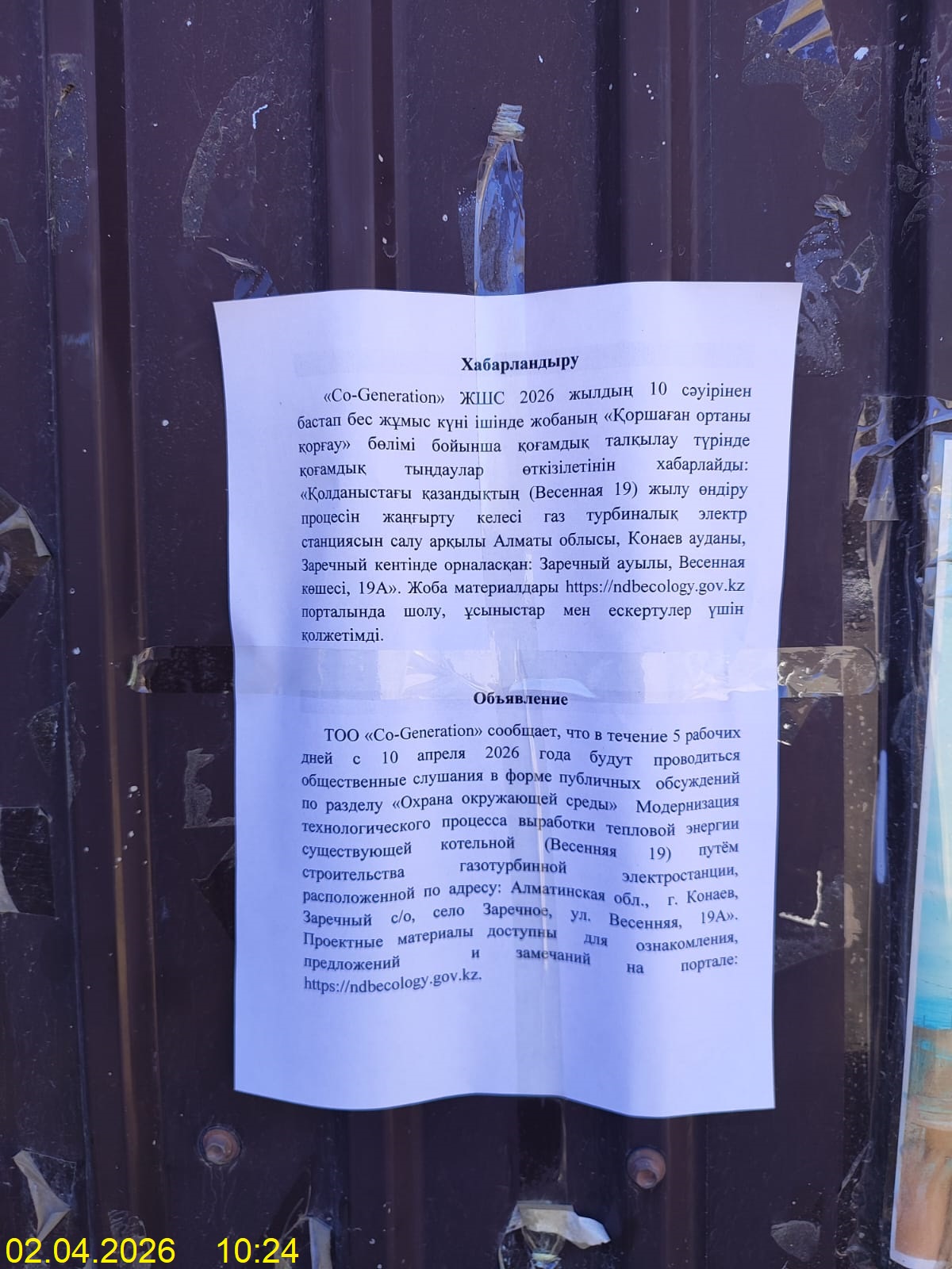 По проекту: РАЗДЕЛ ОХРАНА ОКРУЖАЮЩЕЙ СРЕДЫ «Модернизация технологического процесса выработки тепловой энергии существующей котельной (Весенняя 19) путем строительства газотурбинной электростанции, расположенной по адресу: Алматинская обл., г. Конаев, Заречный с/о, село Заречное, ул. Весенняя, 19А»