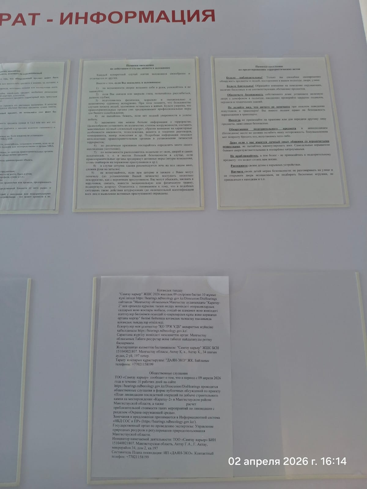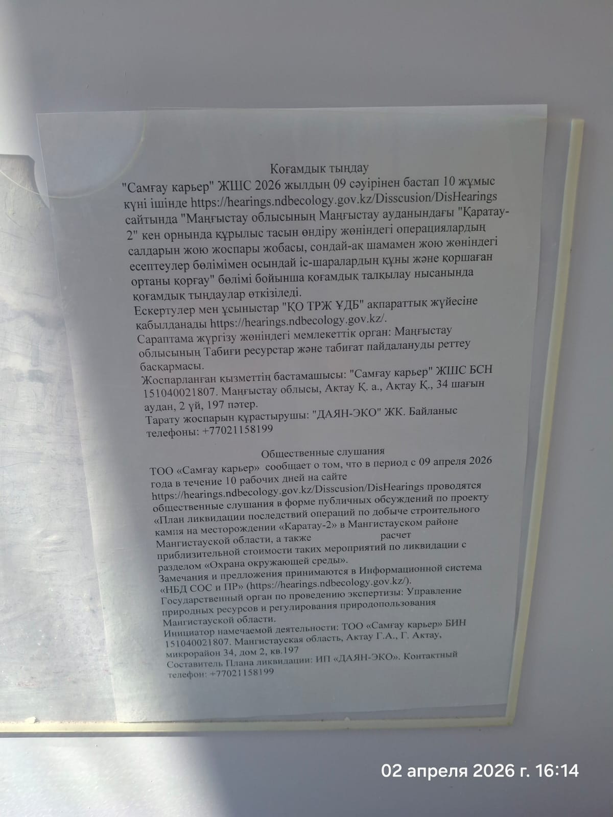 По проекту: «План ликвидации и расчет приблизительной стоимости ликвидации последствий операций по добыче строительного камня на месторождении «Каратау-2» в Мангистауском районе Мангистауской области с разделом ООС