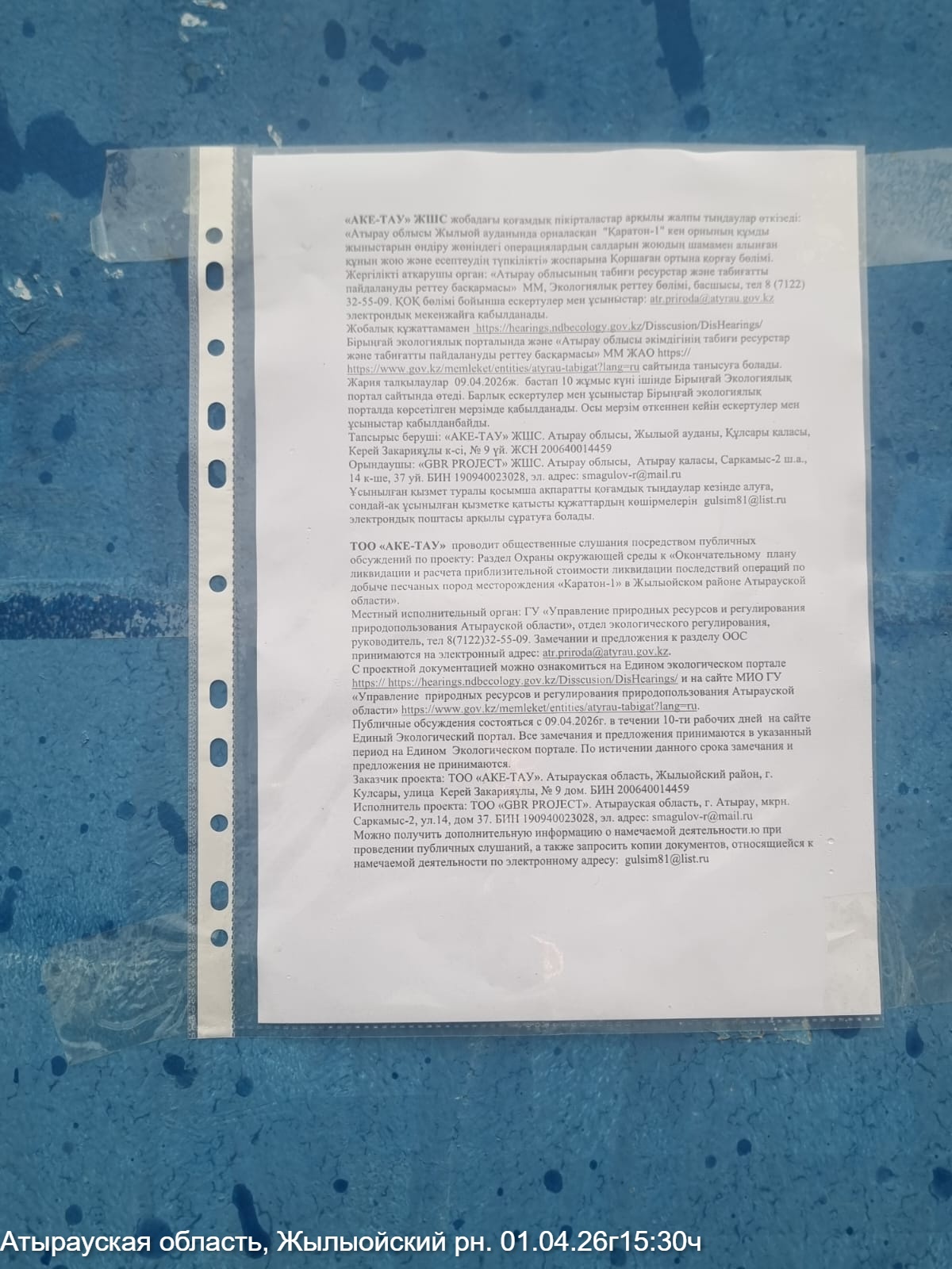 По проекту: Раздел Охраны окружающей среды к Окончательному плану ликвидации и расчета приблизительной стоимости ликвидации последствий операций по добыче песчаных пород месторождения «Каратон-1» в Жылыойском районе Атырауской области.