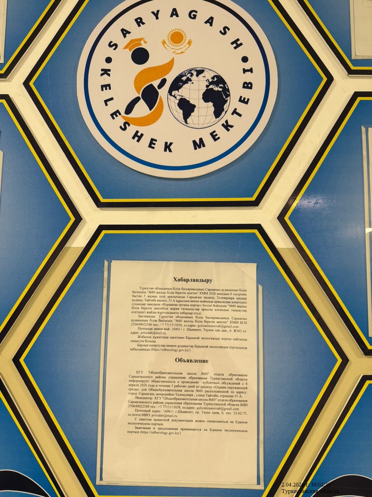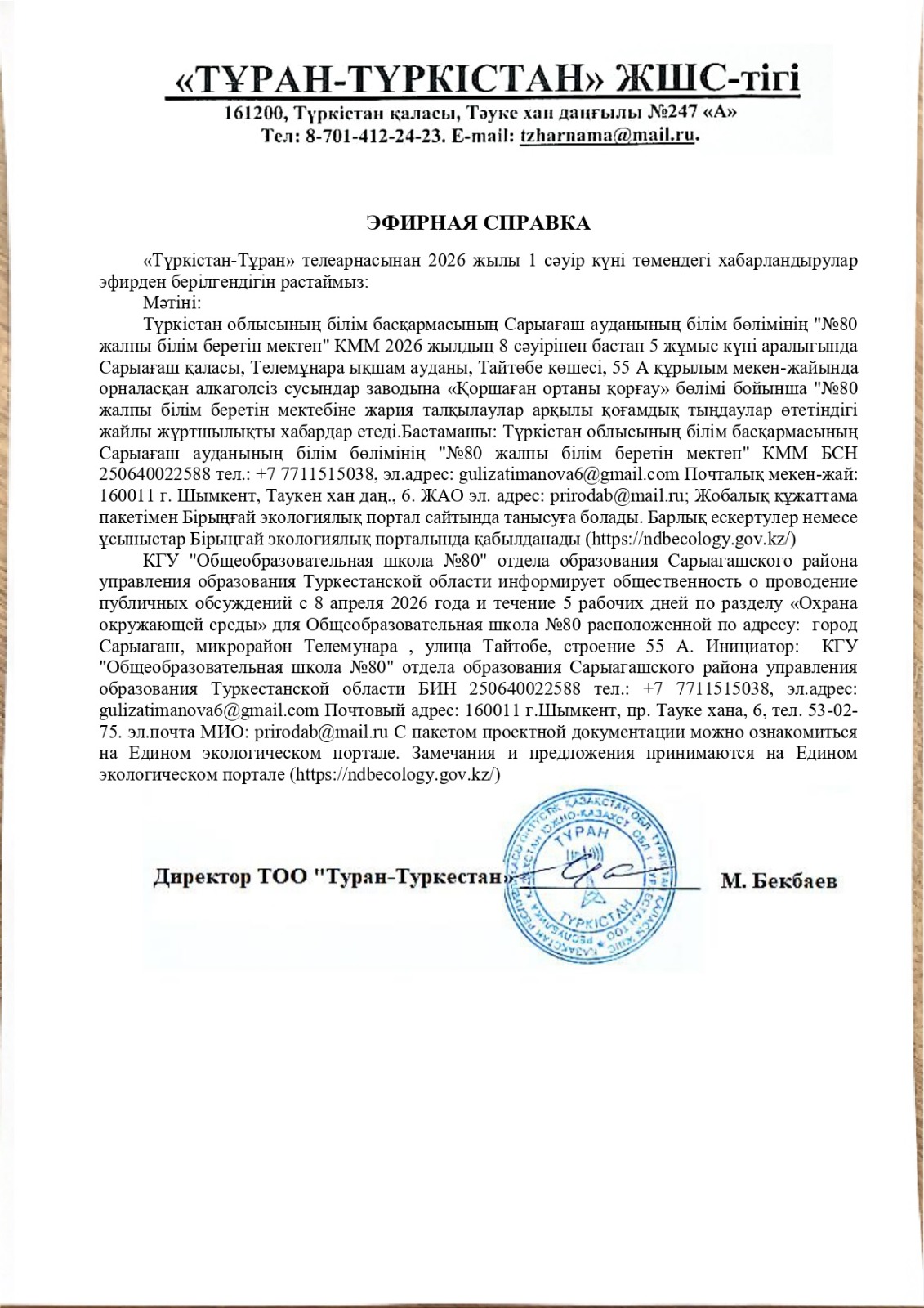 По проекту: РАЗДЕЛ «Охрана окружающей среды» для Общеобразовательная школа №80 расположенной по адресу: город Сарыагаш, микрорайон Телемунара , улица Тайтобе, строение 55 А