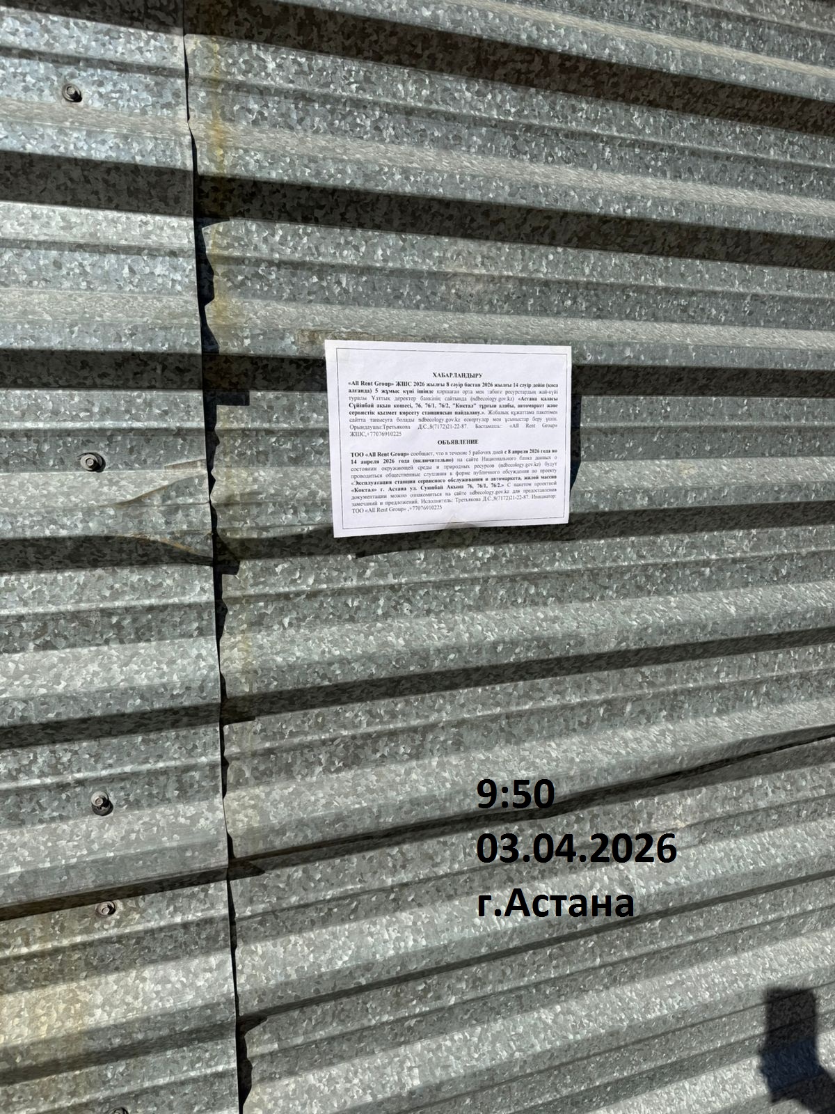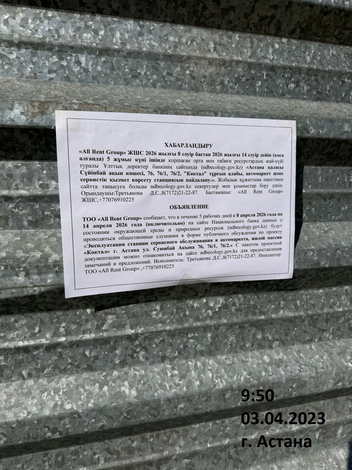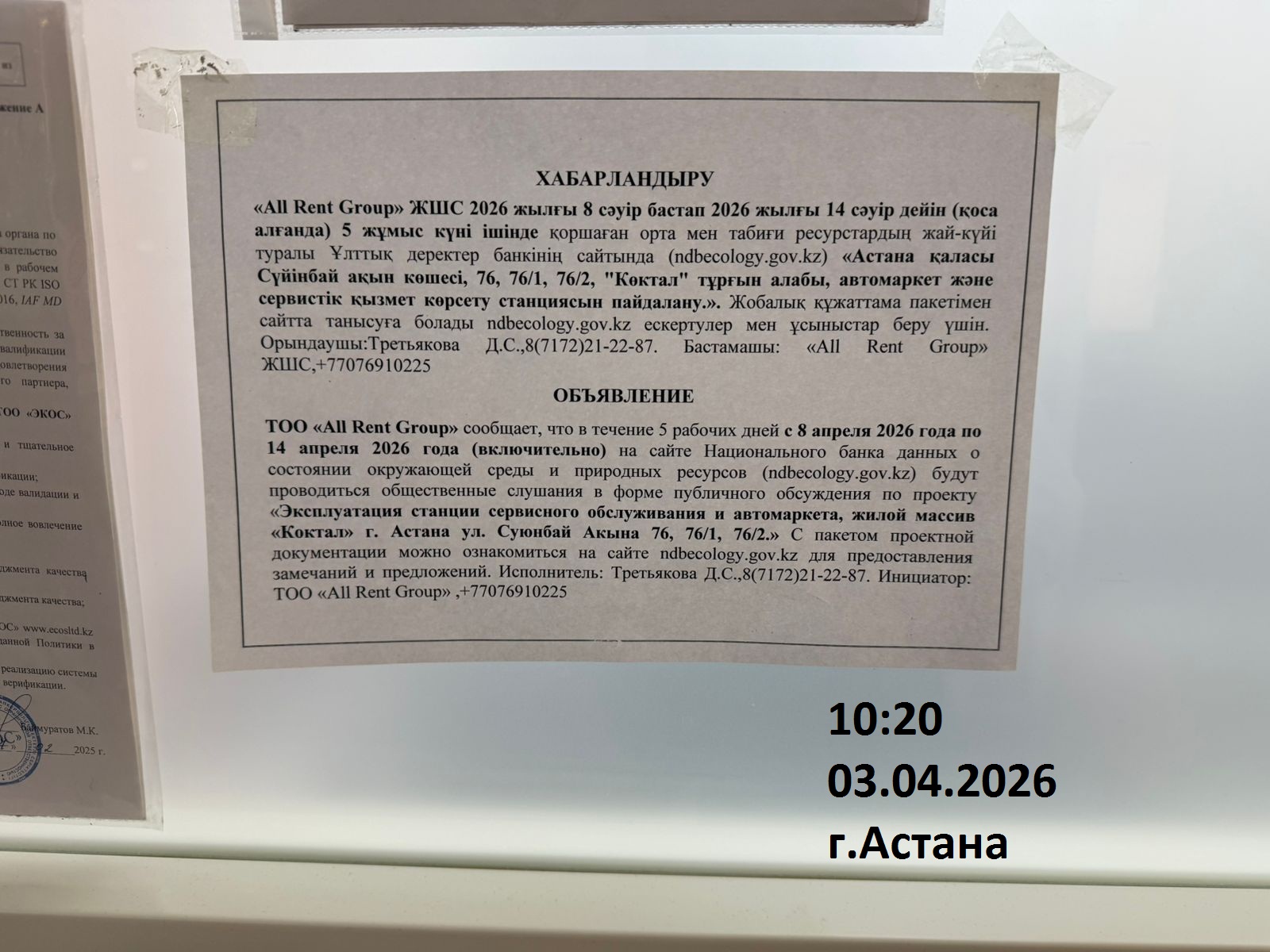 По проекту: РАЗДЕЛ «ОХРАНА ОКРУЖАЮЩЕЙ СРЕДЫ» К РАБОЧЕМУ ПРОЕКТУ «Эксплуатация станции сервисного обслуживания и автомаркета, жилой массив «Коктал» г. Астана ул. Суюнбай Акына 76, 76/1, 76/2»