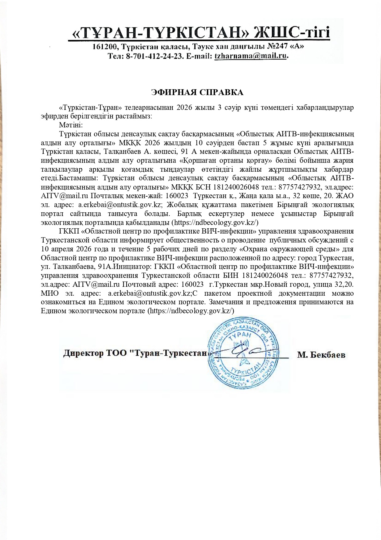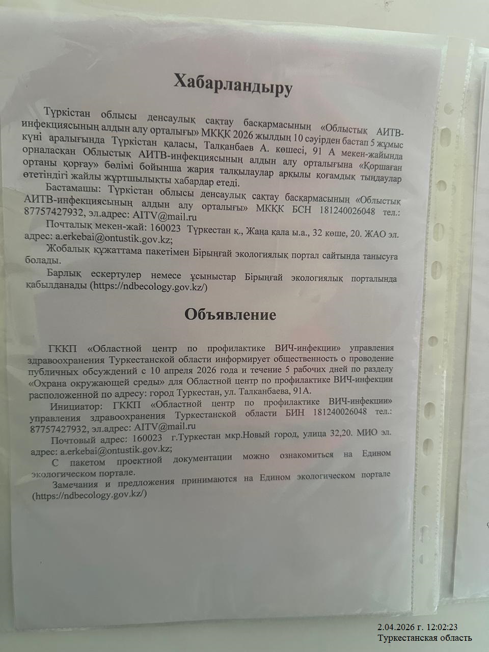 По проекту: РАЗДЕЛ «Охрана окружающей среды» для Областной центр по профилактике ВИЧ-инфекции расположенной по адресу: город Туркестан, ул. Талканбаева, 91А.