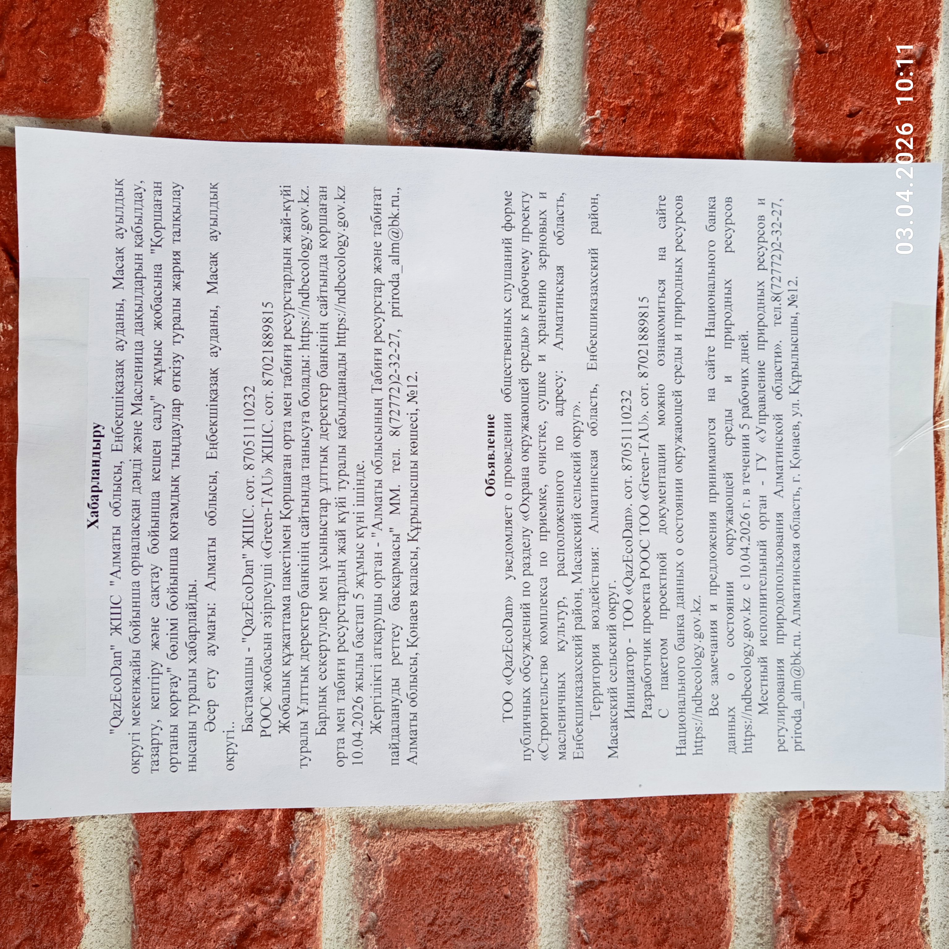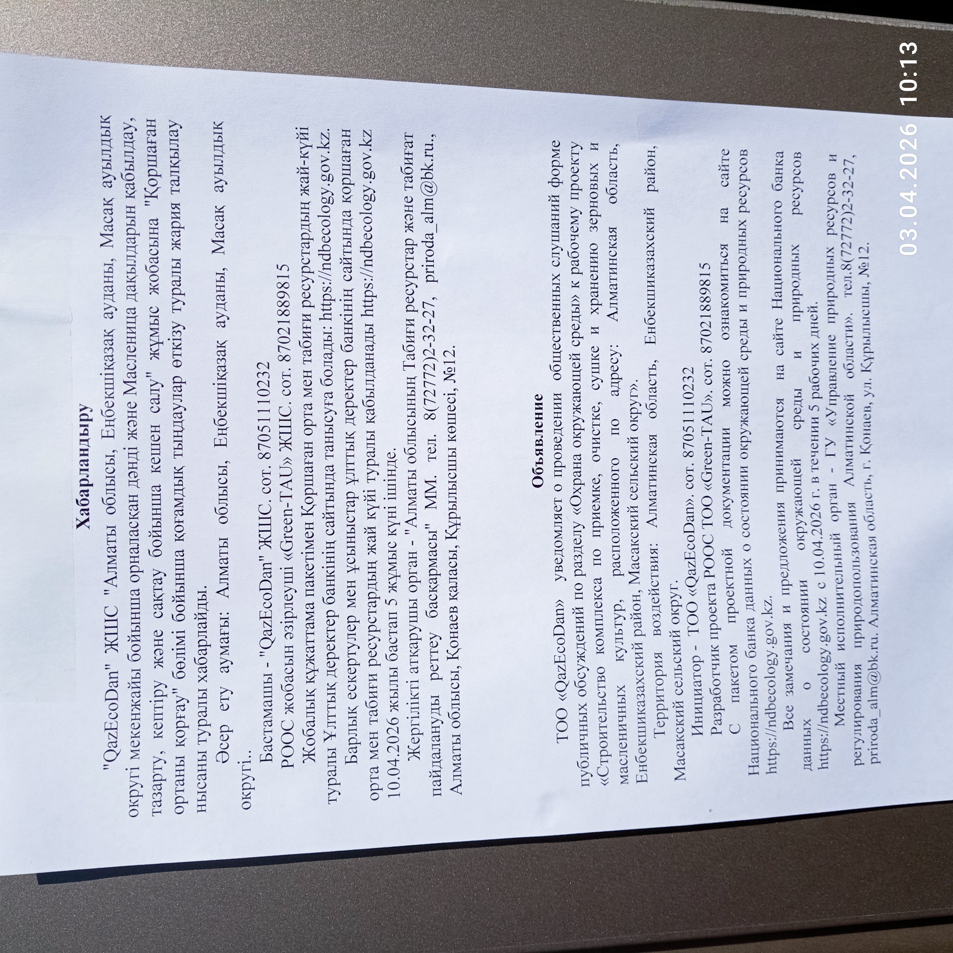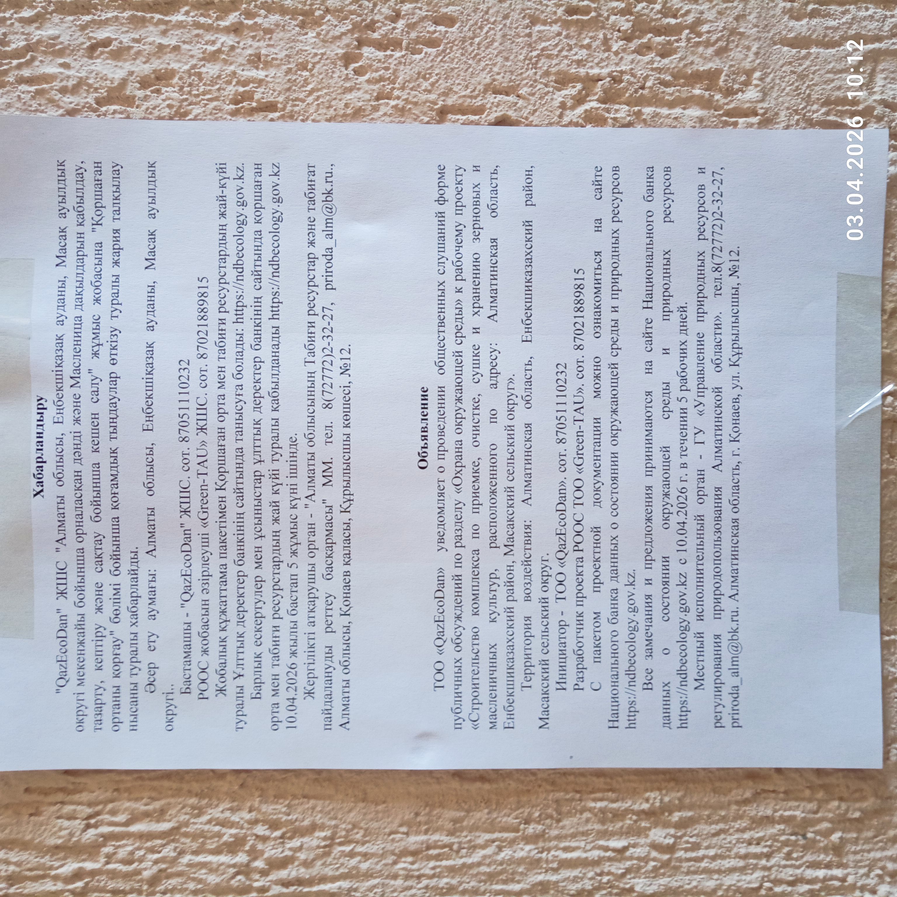 4.2. Дополнительная информация о административно-территориальных единиц: Перечень административно-территориальных единиц на территорию которых может быть оказано воздействие и на территории которых будут проведены общественные слушания (если общественные слушания по одному и тому же предмету слушаний проводятся более чем в одной административно-территориальной единице): Алматинская область, Енбекшиказахский район, Масакский сельский округ.
