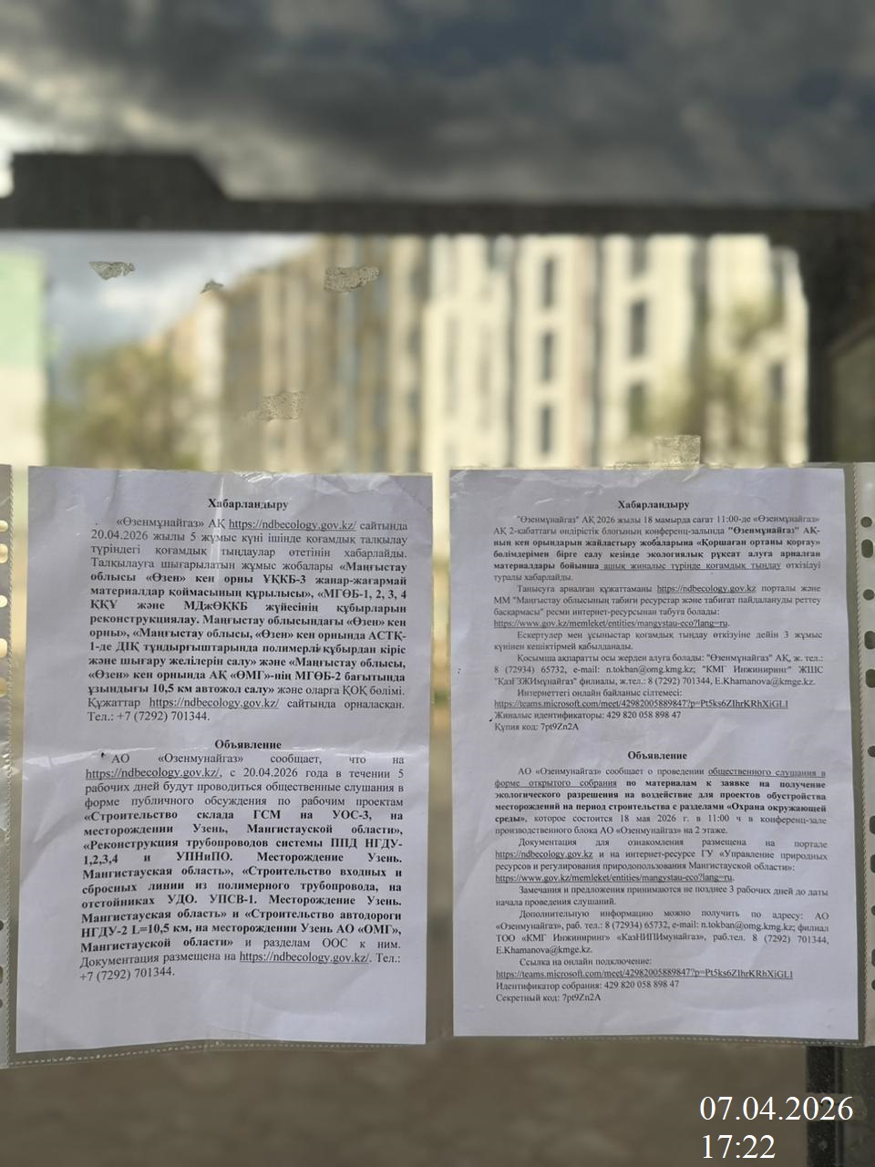 По проекту: Рабочий проект "Строительство автодороги НГДУ-2 L=10,5 км, на месторождении Узень АО «ОМГ», Мангистауской области" с разделом ООС
