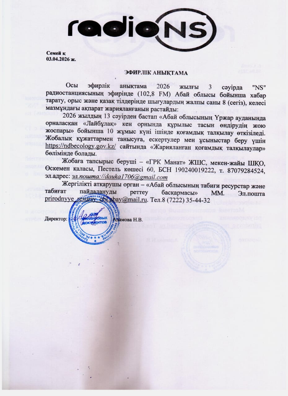 1. Инициатор: Товарищество с ограниченной ответственностью ""ГРК Манат""