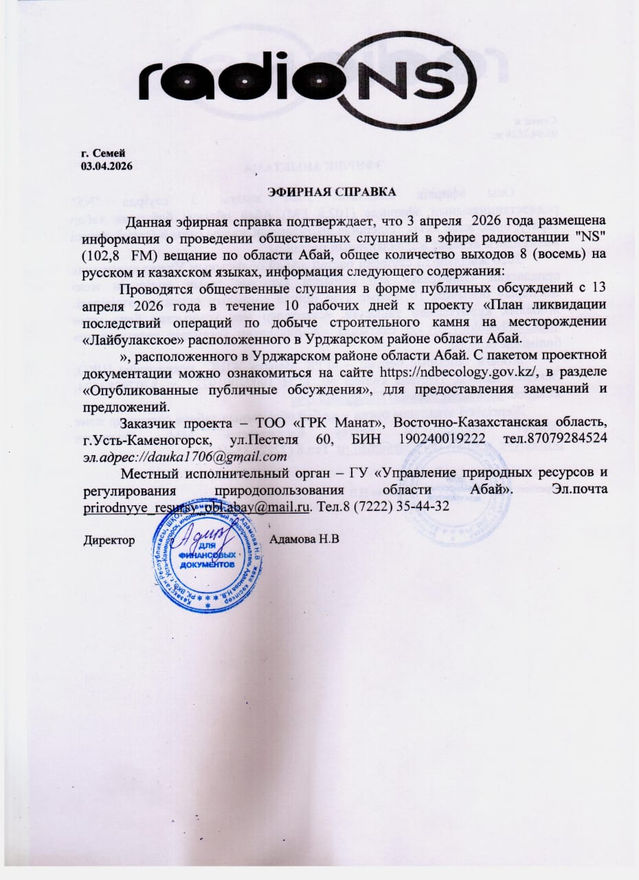 По проекту: План ликвидации последствий операций по добыче строительного камня на месторождении «Лайбулакское» расположенного в Урджарском районе области Абай