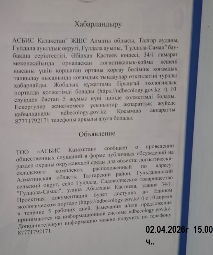 По проекту: Раздел «Охрана окружающей среды» для объекта: логистически-складского комплекса, расположенный по адресу: Алматинская область, Талгарский район, Гульдалинский сельский округ, село Гулдала, Садоводческое товарищество "Гулдала-Самал", улица Абылхана Кастеева, здание 34/1»
