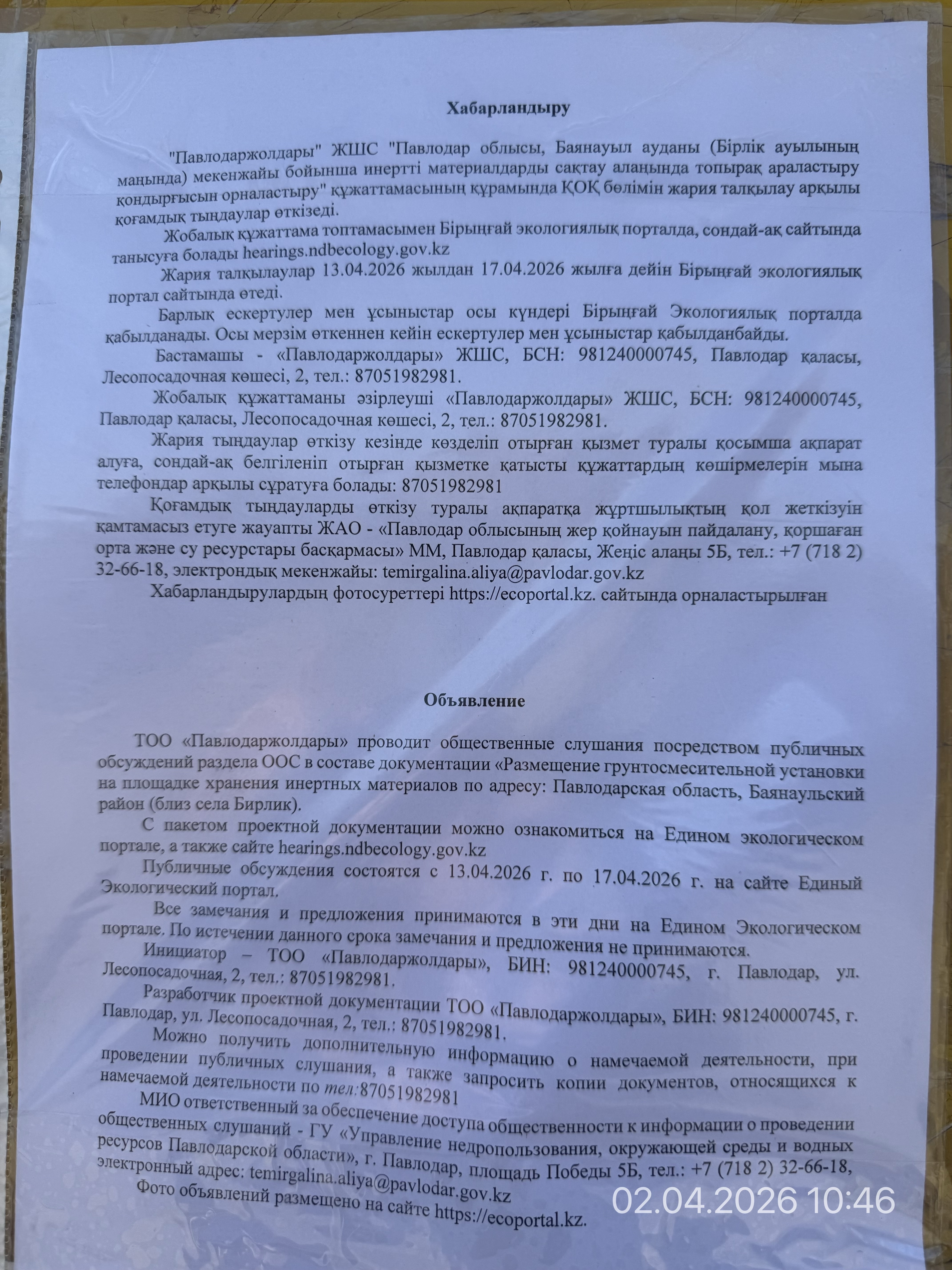 По проекту: Раздел ООС в составе документации "Размещение грунтосмесительной установки на площадке хранения инертных материалов по адресу: Павлодарская область, Баянаульский район ."