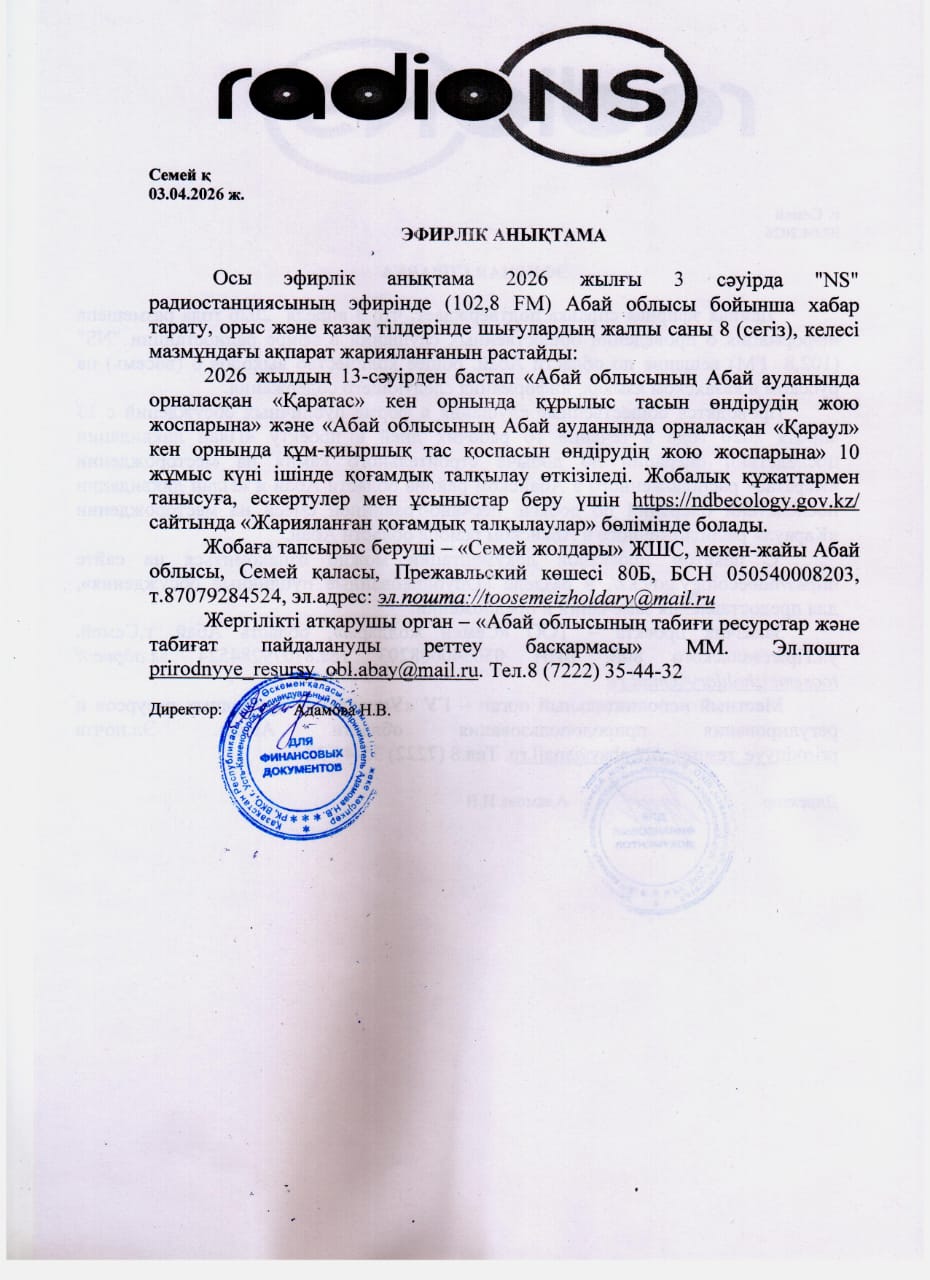| 1 | область Абай, Абайский район, Карааульский с.о. |