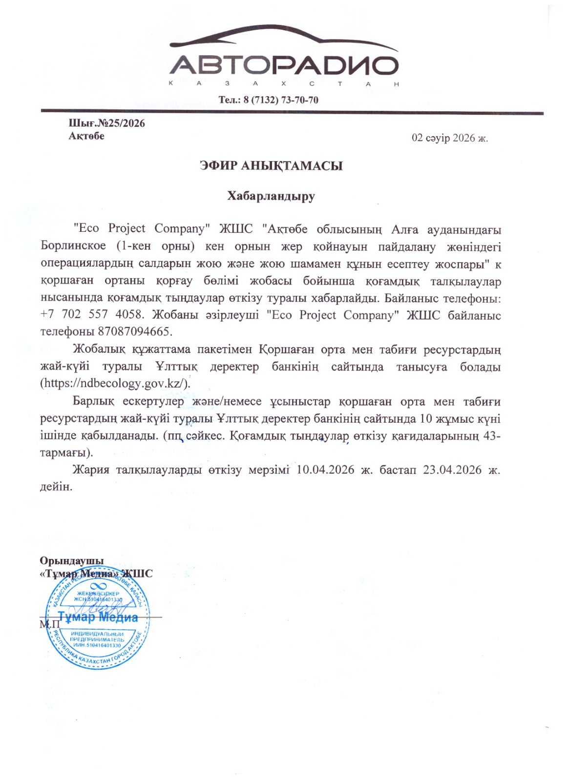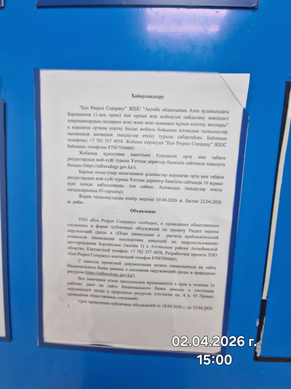1.3. Контакты:ecoproject.company@bk.ru; https://ndbecology.gov.kz/;