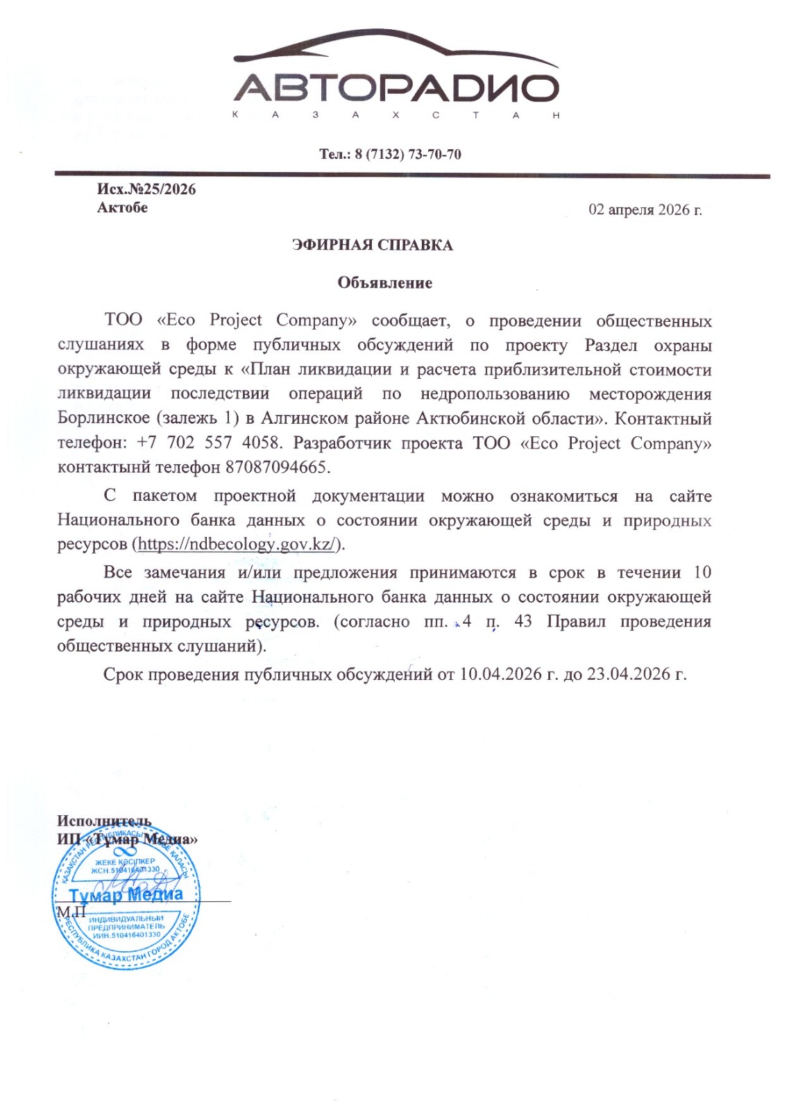 По проекту: Раздел охраны окружающей среды к «План ликвидации и расчета приблизительной стоимости ликвидации последствии операций по недропользованию месторождения Борлинское (залежь 1) в Алгинском районе Актюбинской области»