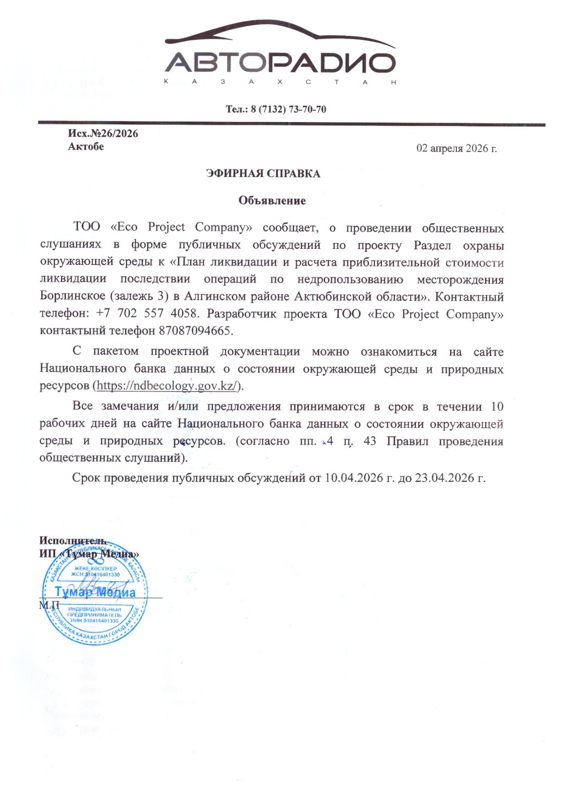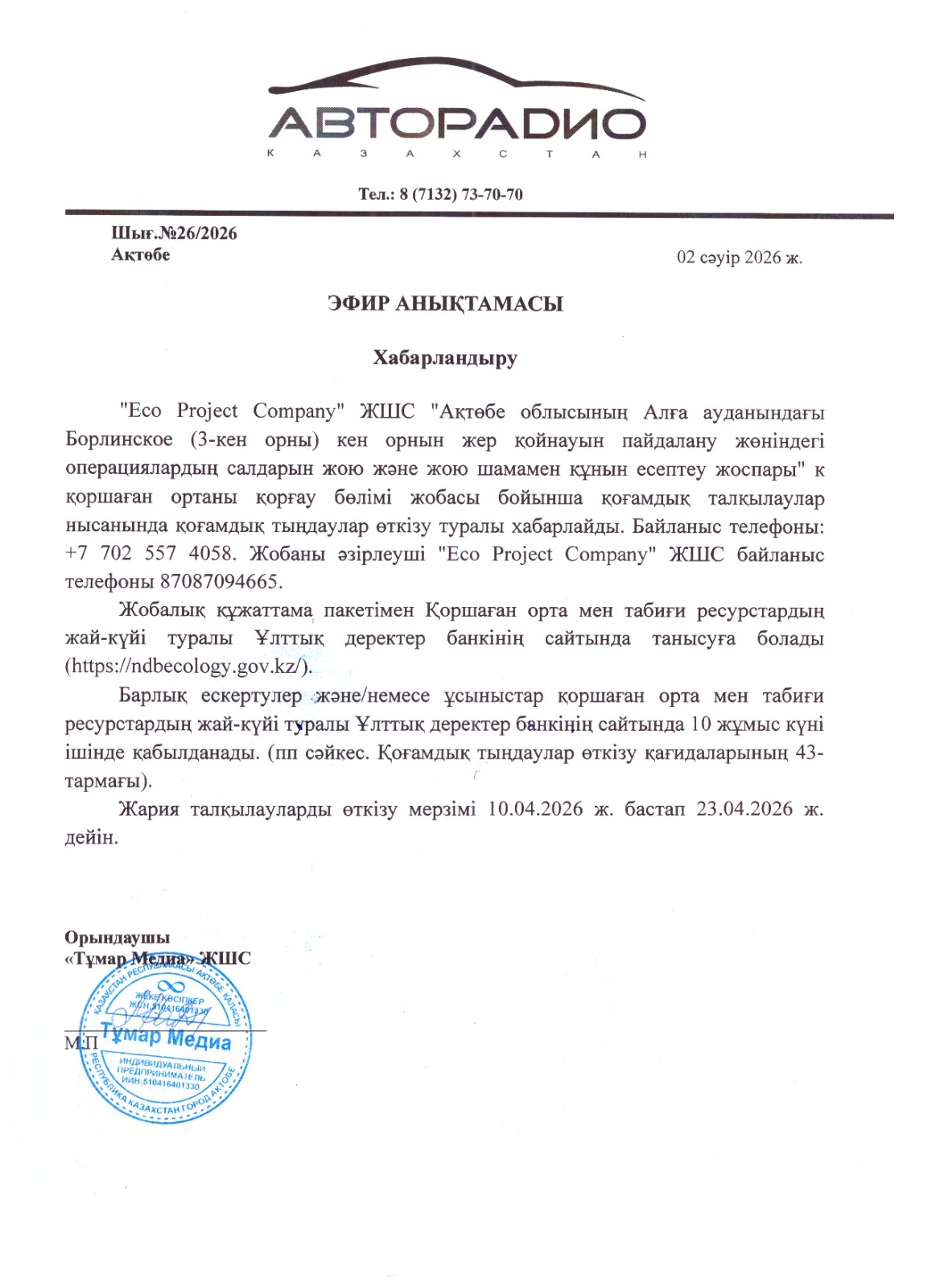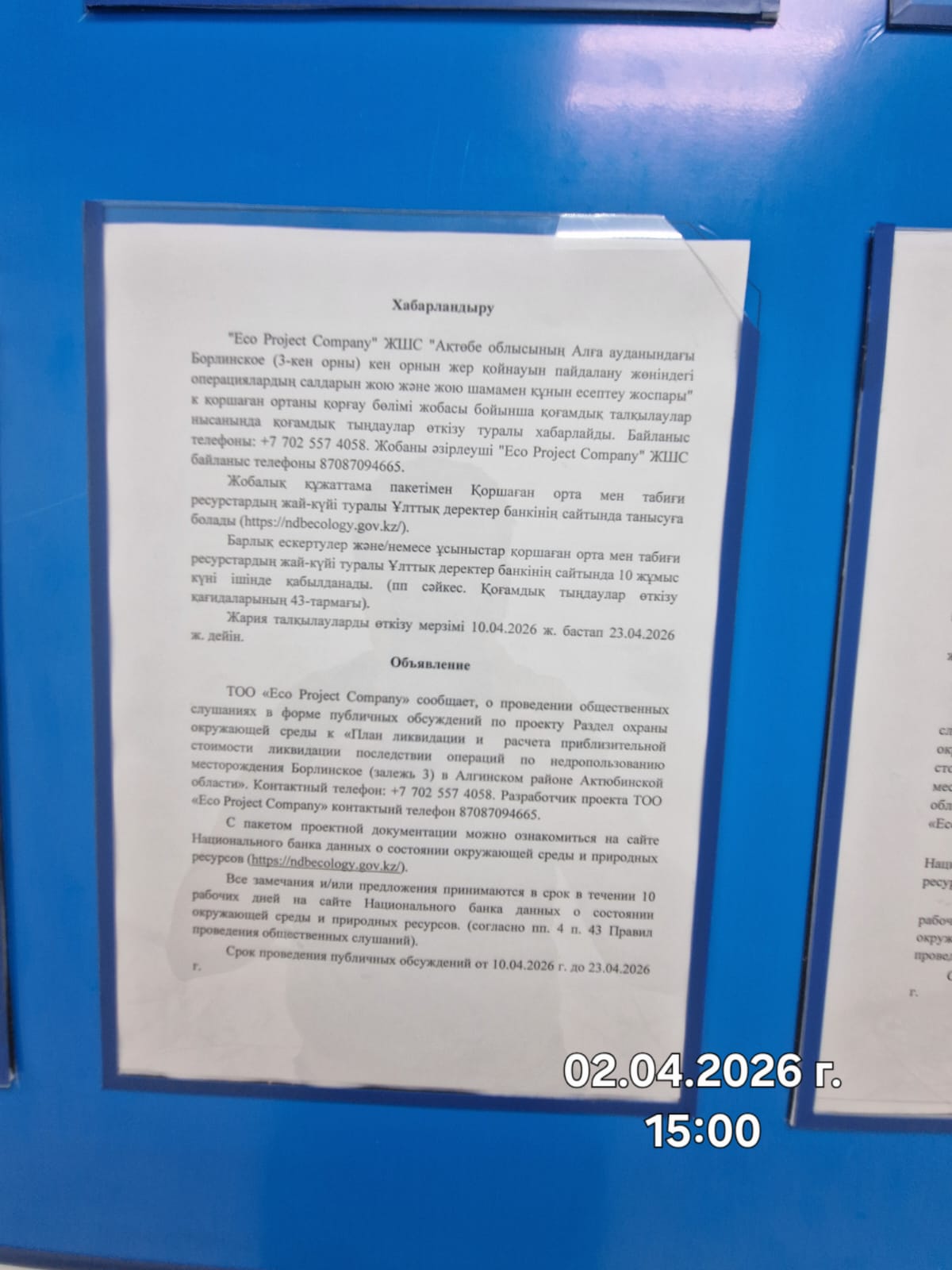1.3. Контакты:ecoproject.company@bk.ru; https://ndbecology.gov.kz/;