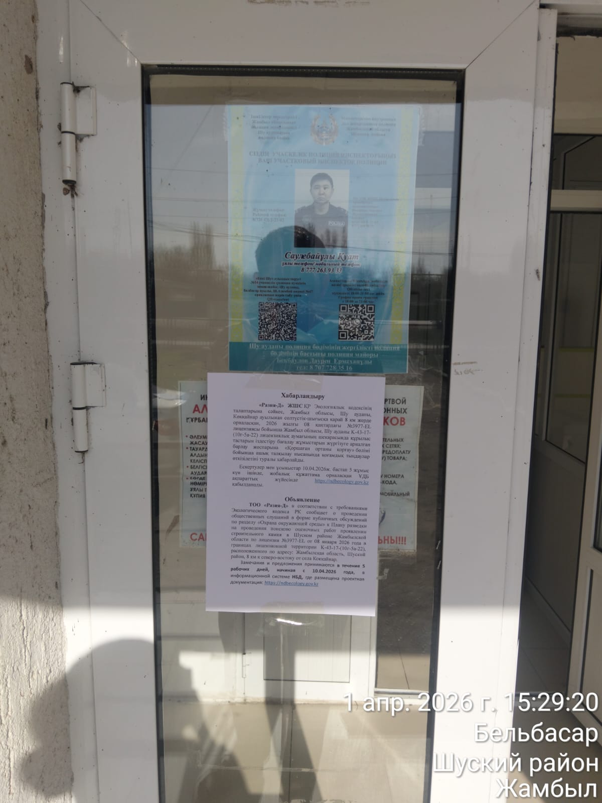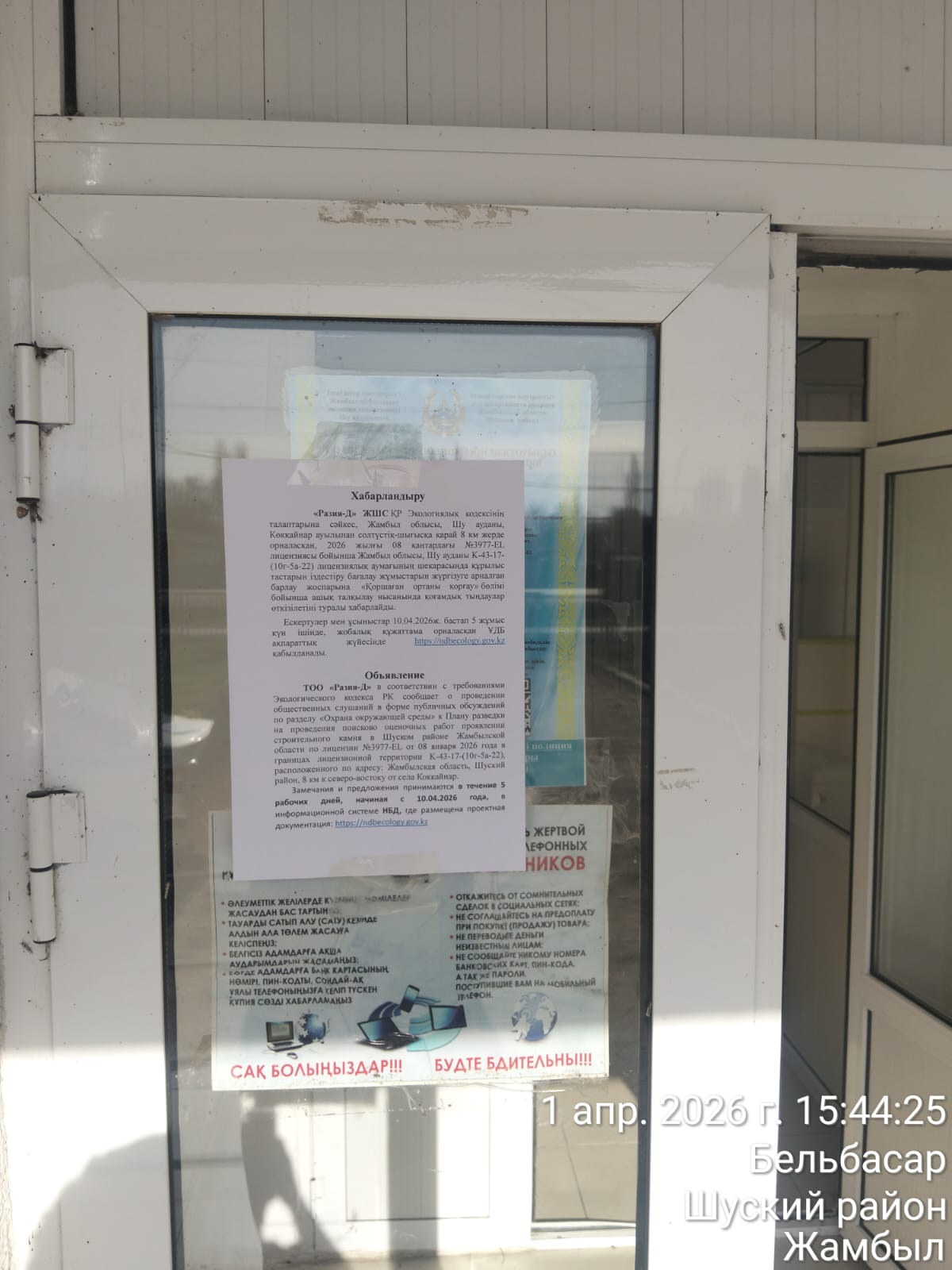 По проекту: разделу «Охрана окружающей среды» к Плану разведки на проведения поисково оценочных работ проявлении строительного камня в Шуском районе Жамбылской области по лицензии №3977-EL от 08 января 2026 года в границах лицензионной территории K-43-17-(10г-5а-22), расположенного по адресу: Жамбылская область, Шуский район, 8 км к северо-востоку от села Коккайнар