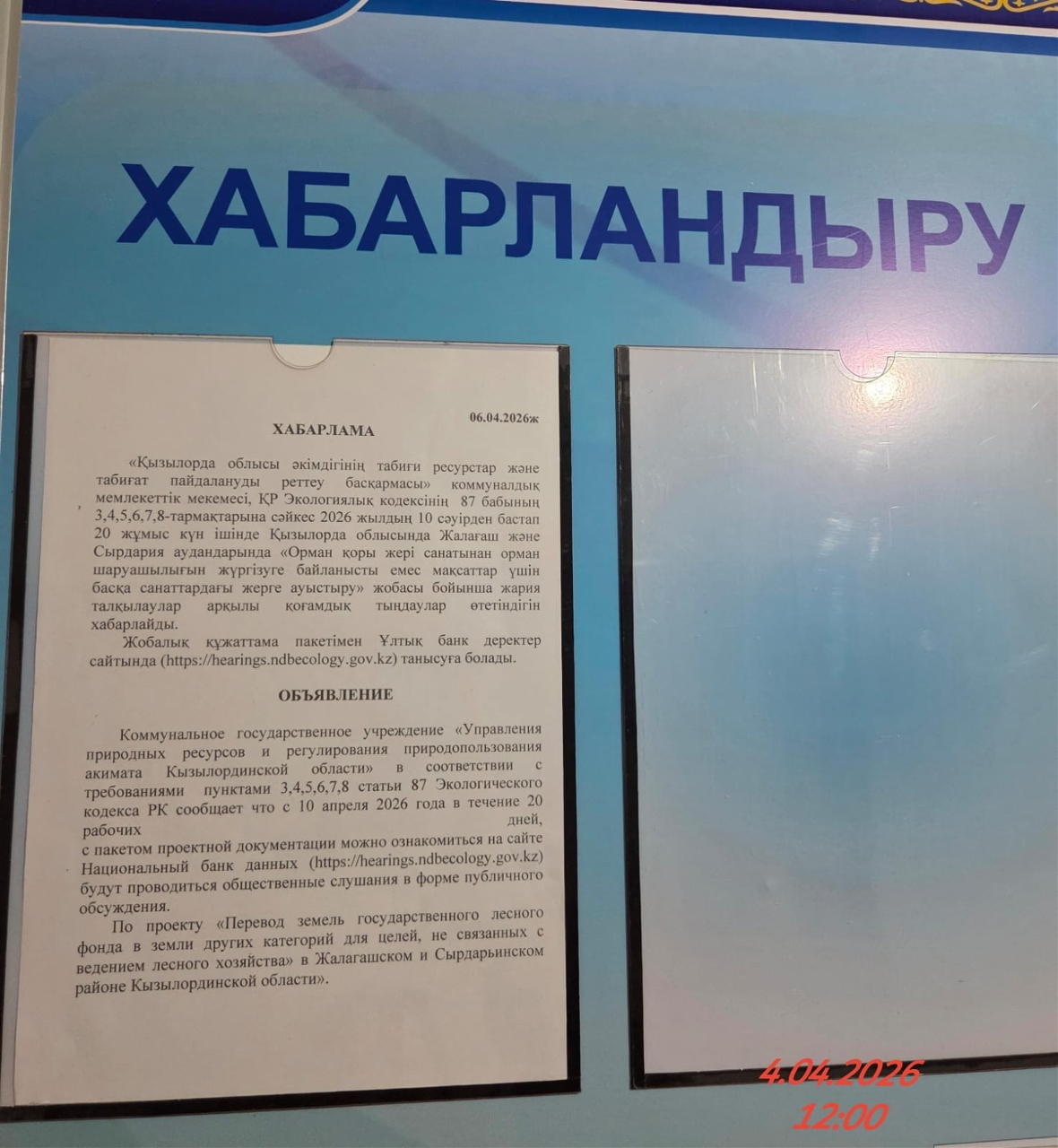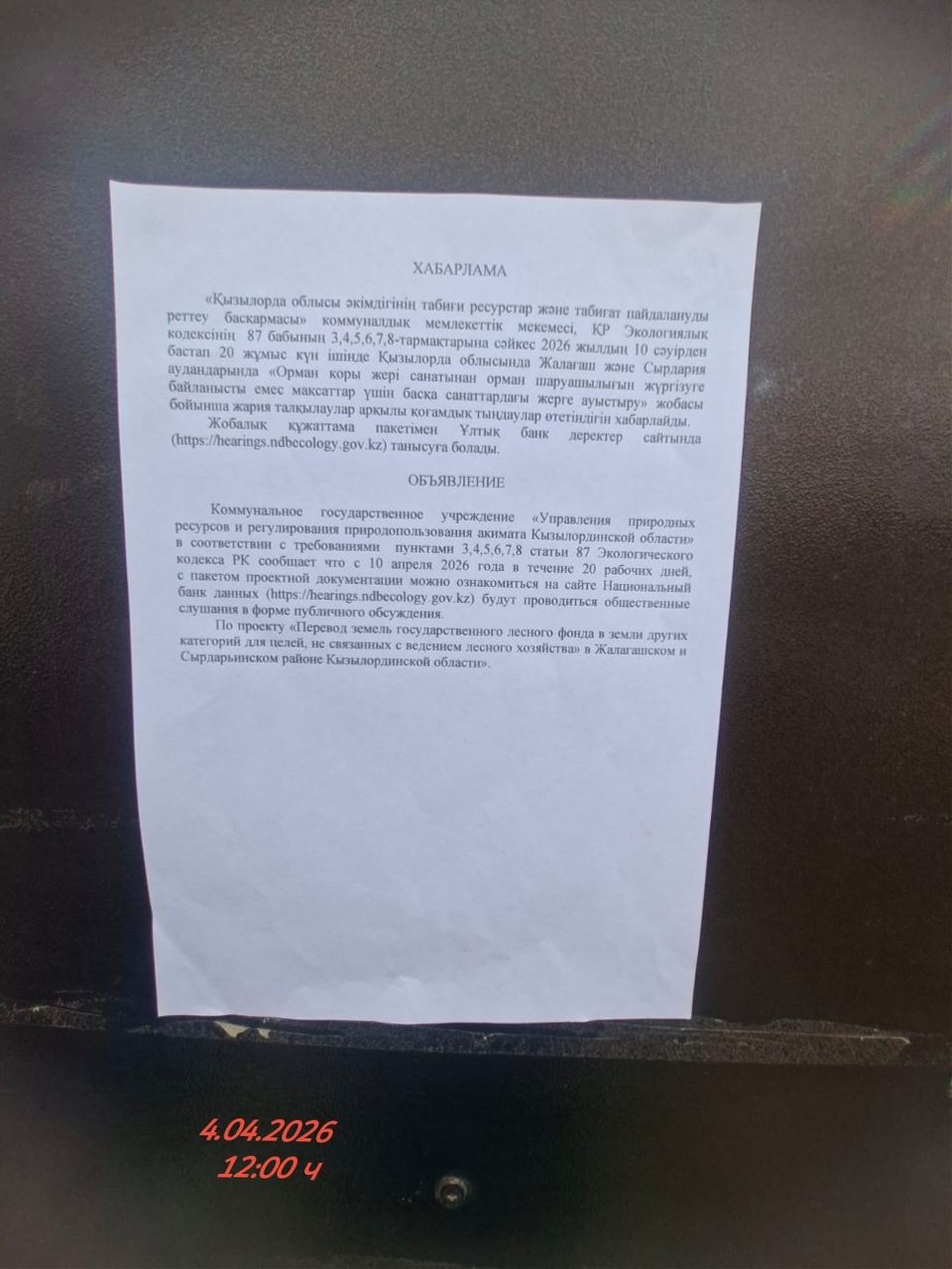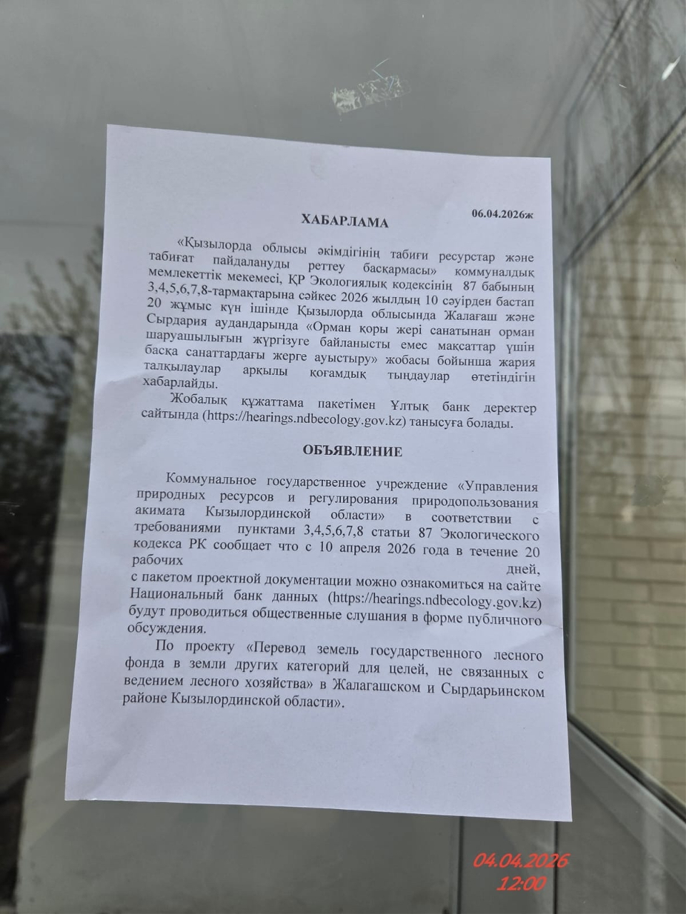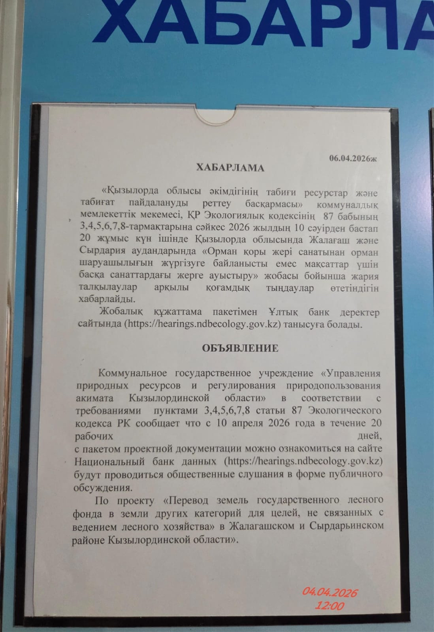 По проекту: по проекту «Перевод земель государственного лесного фонда в земли других категорий для целей, не связанных с ведением лесного хозяйства» в Жалагашском и Сырдарьинском районе Кызылординской области»