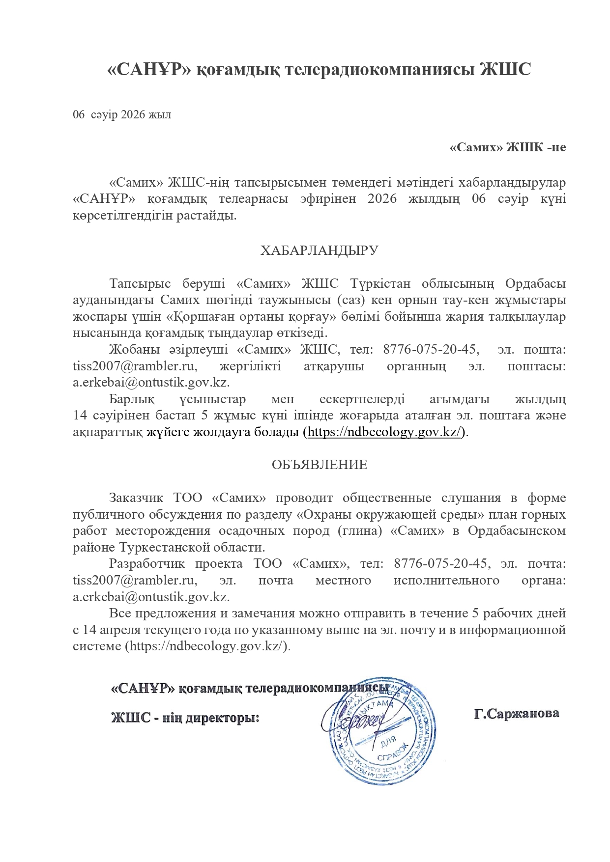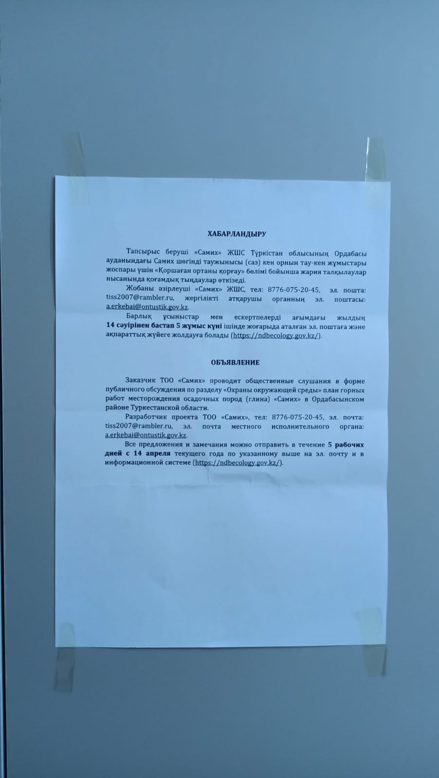 По проекту: РАЗДЕЛ «ОХРАНЫ ОКРУЖАЮЩЕЙ СРЕДЫ» для план горных работ месторождения осадочных пород (глина) «Самих» в Ордабасынском районе Туркестанской области