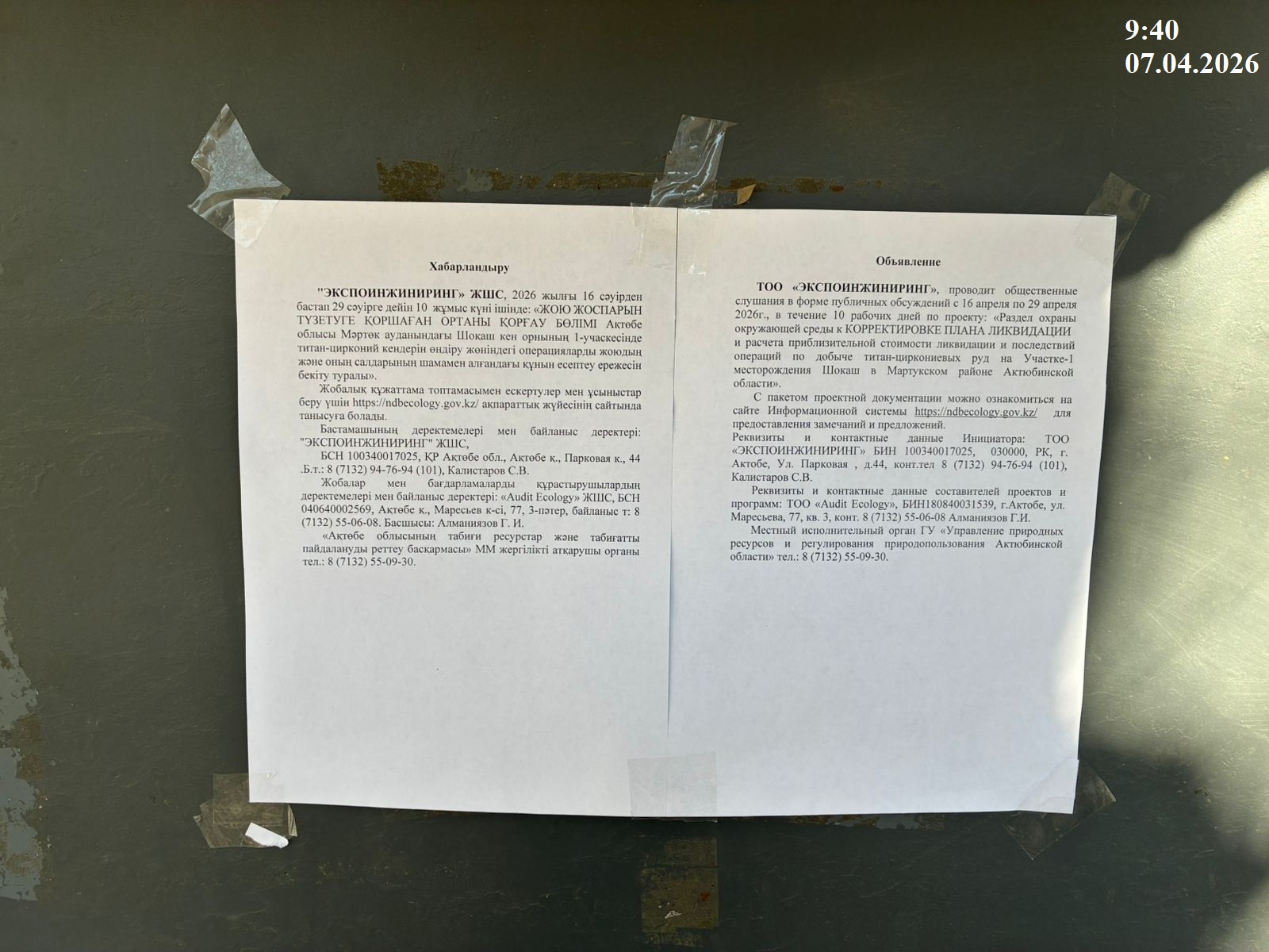 По проекту: Раздел охраны окружающей среды к КОРРЕКТИРОВКЕ ПЛАНА ЛИКВИДАЦИИ и расчета приблизительной стоимости ликвидации и последствий операций по добыче титан-циркониевых руд на Участке-1 месторождения Шокаш в Мартукском районе Актюбинской области