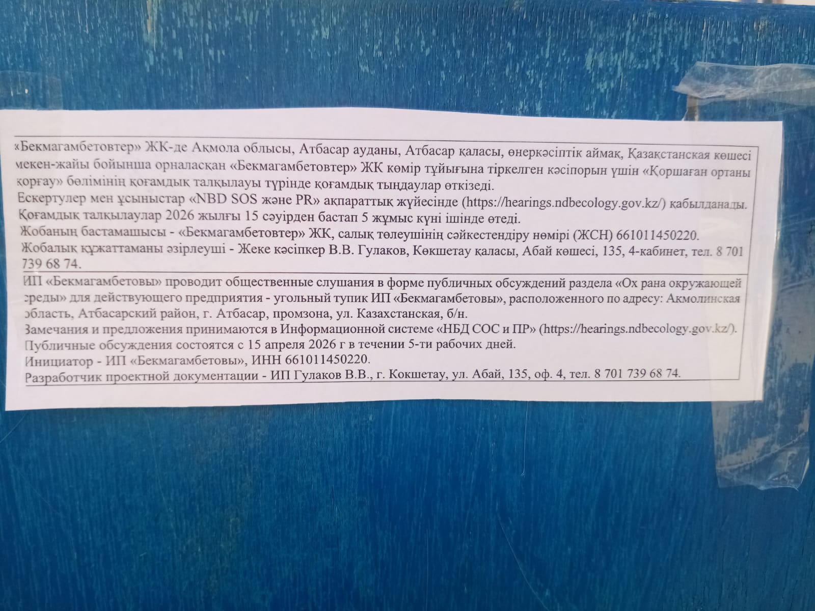 По проекту: Раздел “Охрана окружающей среды” угольный тупик ИП «Бекмагамбетовы»