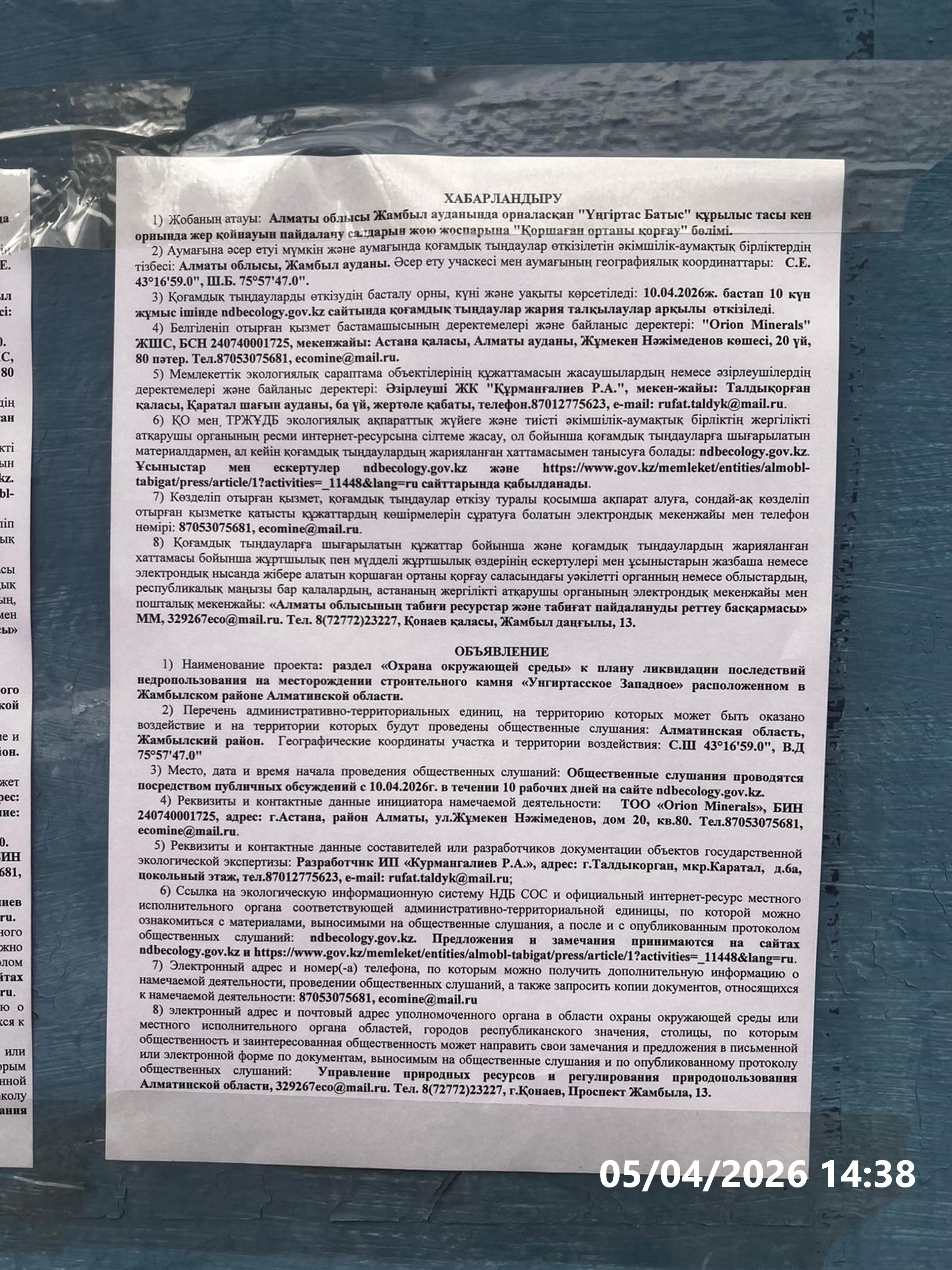 1. Инициатор: Товарищество с ограниченной ответственностью "Orion Minerals"