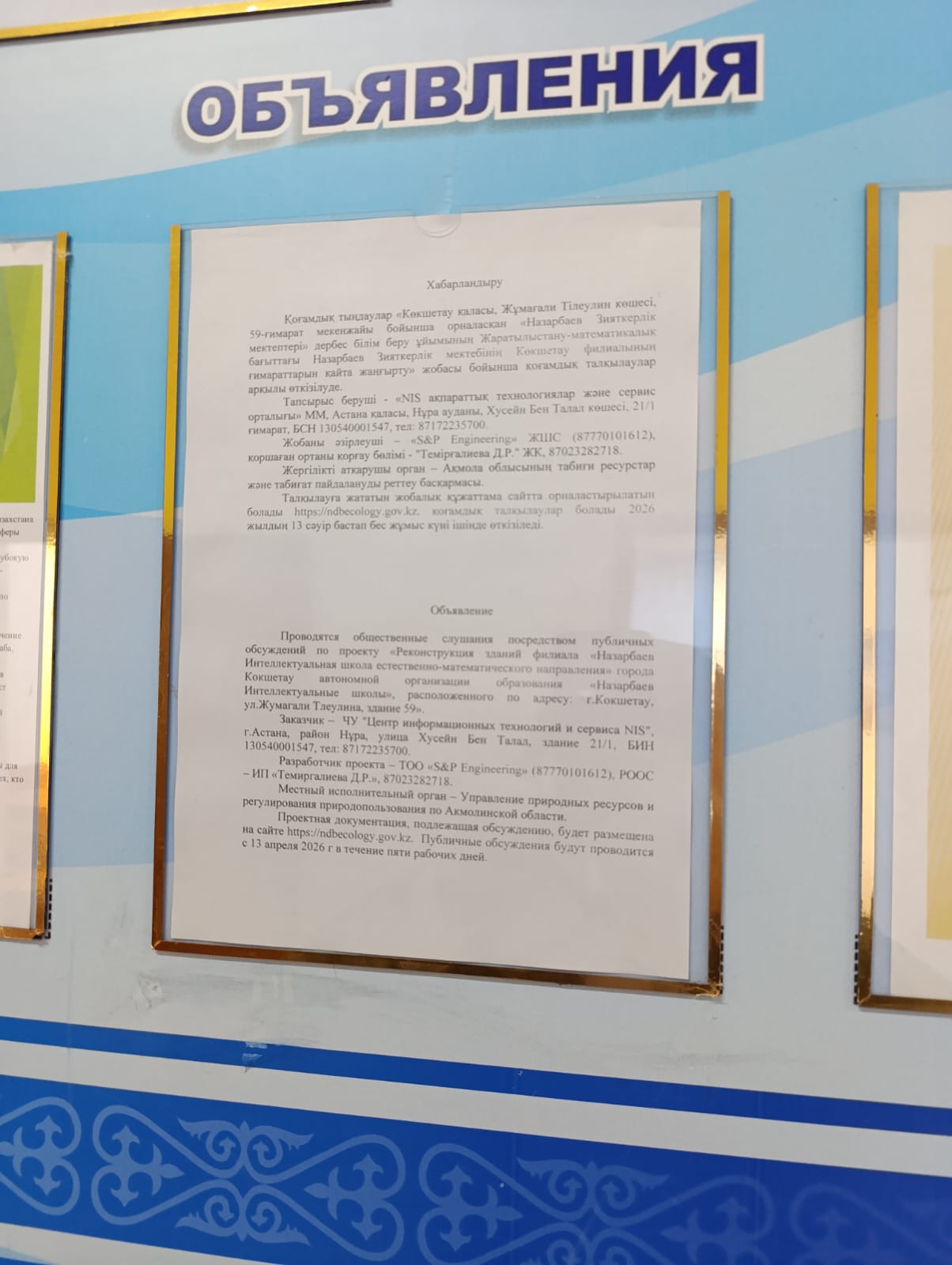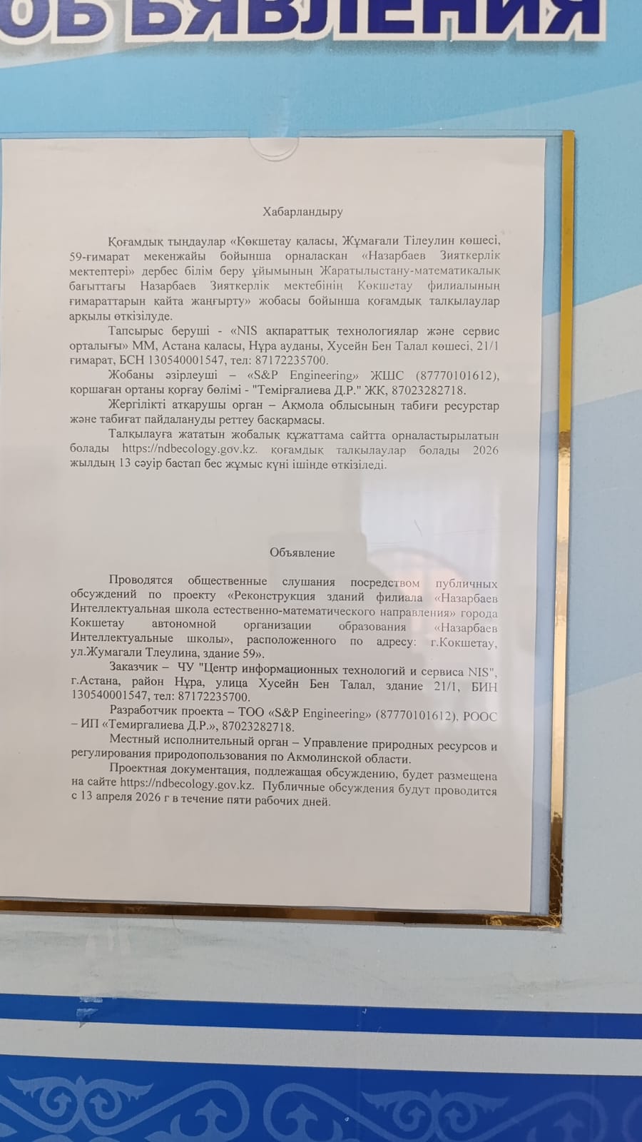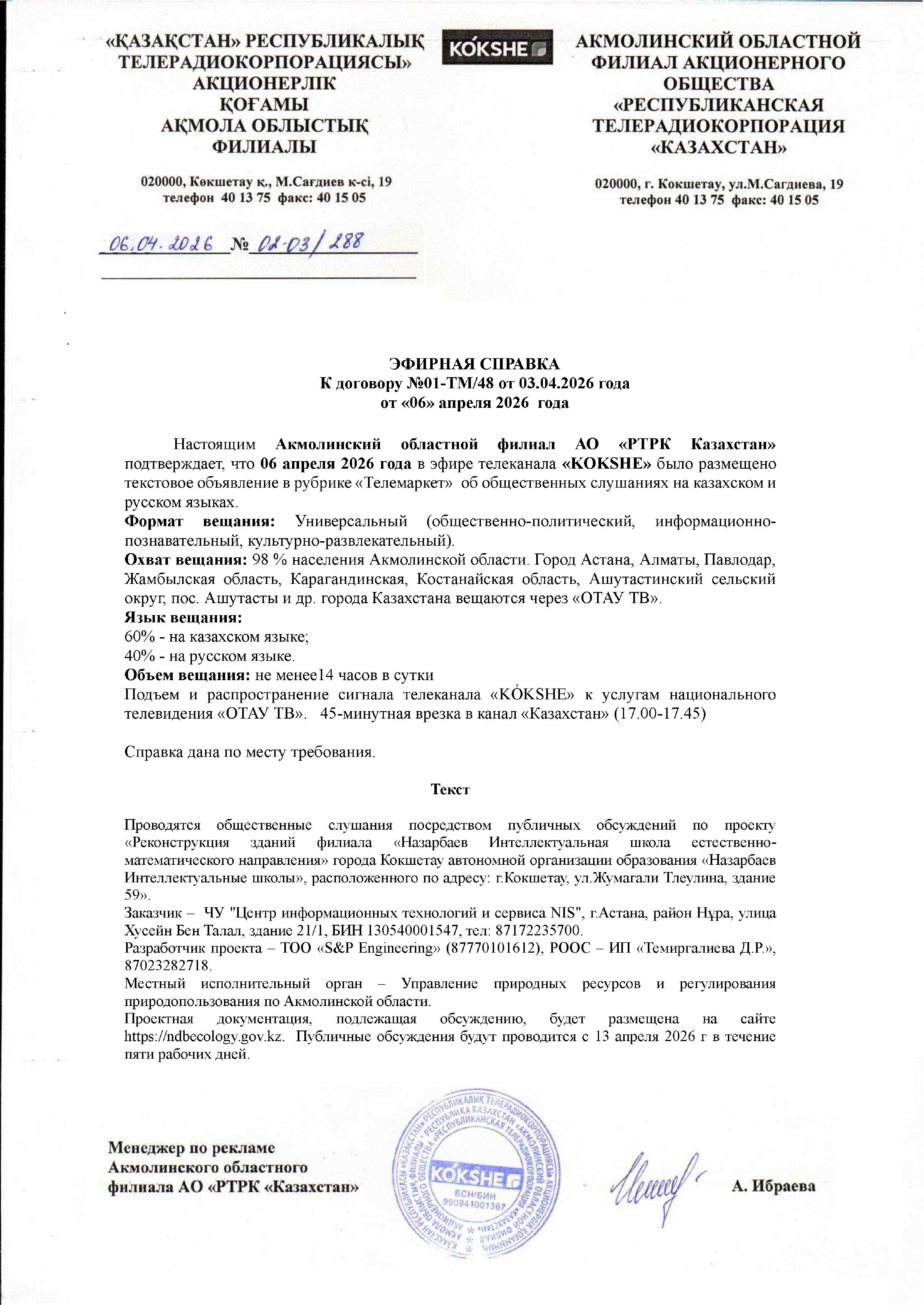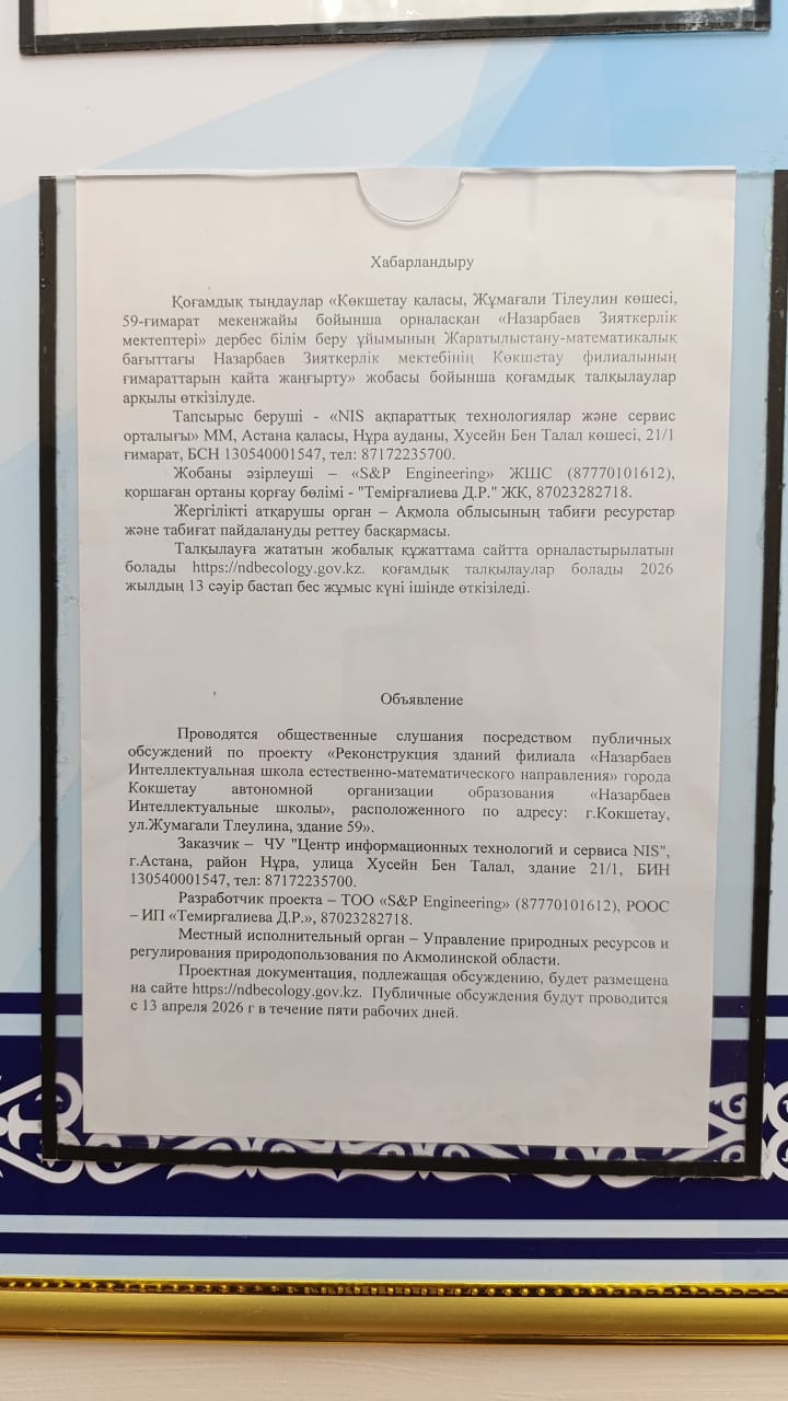 По проекту: «Реконструкция зданий филиала «Назарбаев Интеллектуальная школа естественно-математического направления» города Кокшетау автономной организации образования «Назарбаев Интеллектуальные школы», расположенного по адресу: г.Кокшетау, ул.Жумагали Тлеулина, здание 59»