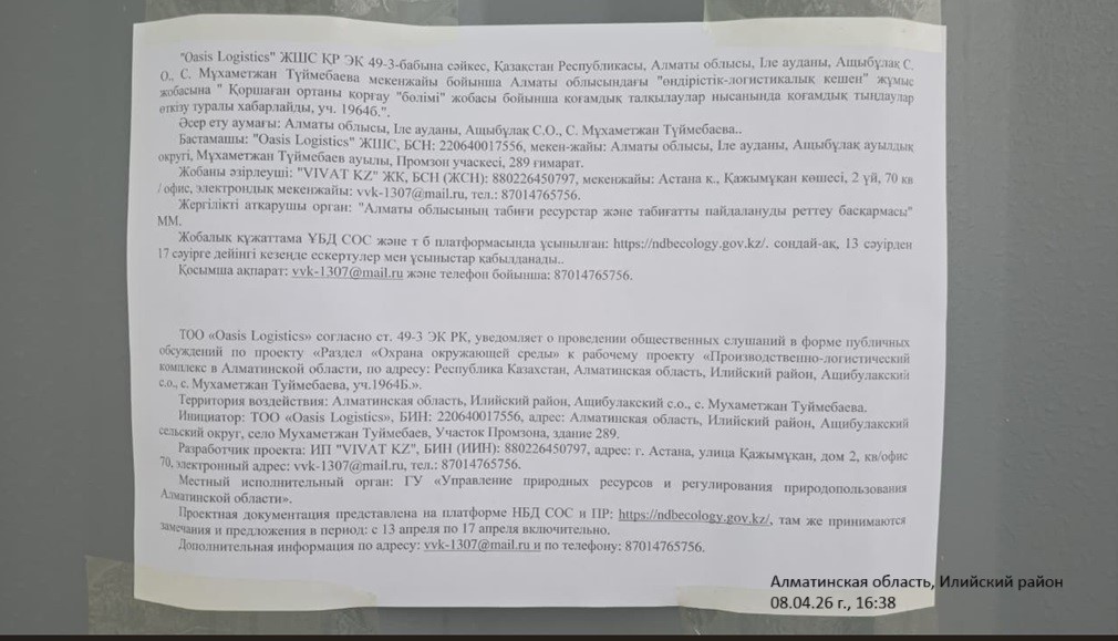 По проекту: Раздел «Охраны окружающей среды» к рабочему проекту «Производственно-логистический комплекс в Алматинской области, по адресу: Республика Казахстан, Алматинская область, Илийский район, Ащибулакский с.о., с. Мухаметжан Туймебаева, уч.1964Б.»