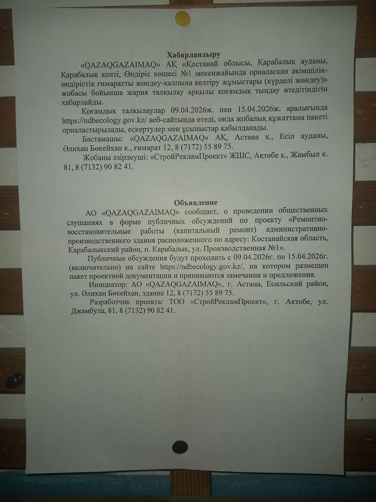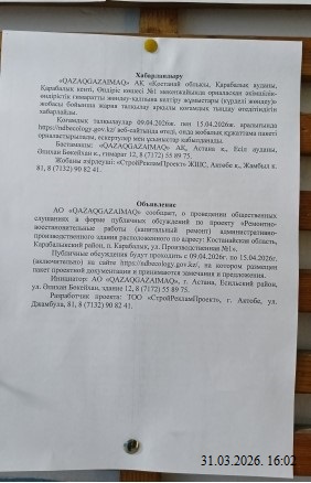 По проекту: Раздел ООС к РП «Ремонтно-восстановительные работы (капитальный ремонт) административно-производственного здания расположенного по адресу: Костанайская область, Карабалыкский район, п. Карабалык, ул. Производственная №1»