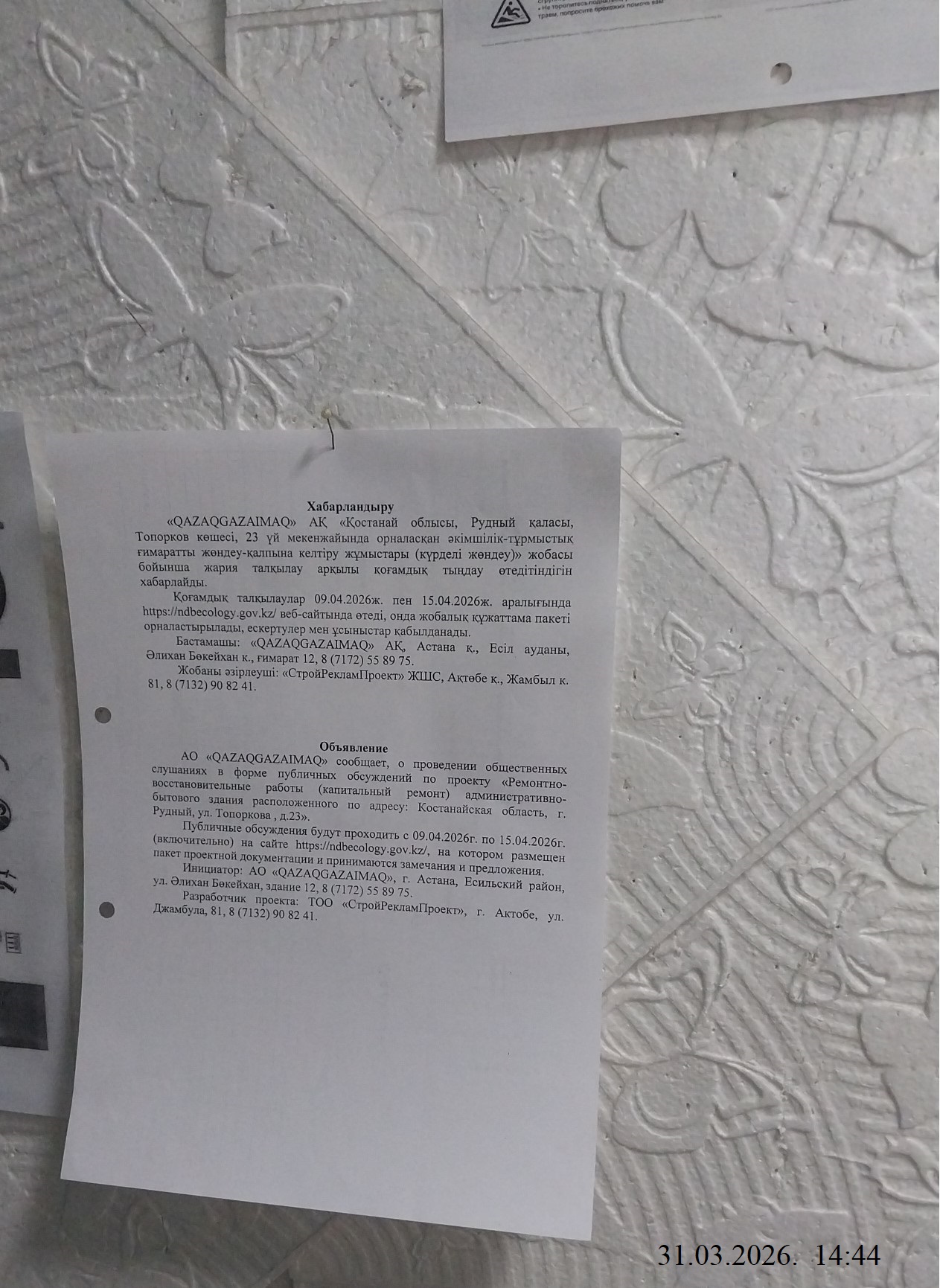 По проекту: Раздел ООС к РП «Ремонтно-восстановительные работы (капитальный ремонт) административно-бытового здания расположенного по адресу:Костанайская область, г.Рудный, ул.Топоркова , д.23»