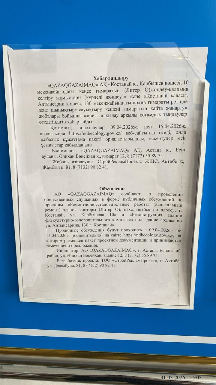 По проекту: Раздел ООС к РП «Ремонтно-восстановительные работы (капитальный ремонт) здания конторы (Литер О), находящейся по адресу: г. Костанай, ул. Карбышева 10»