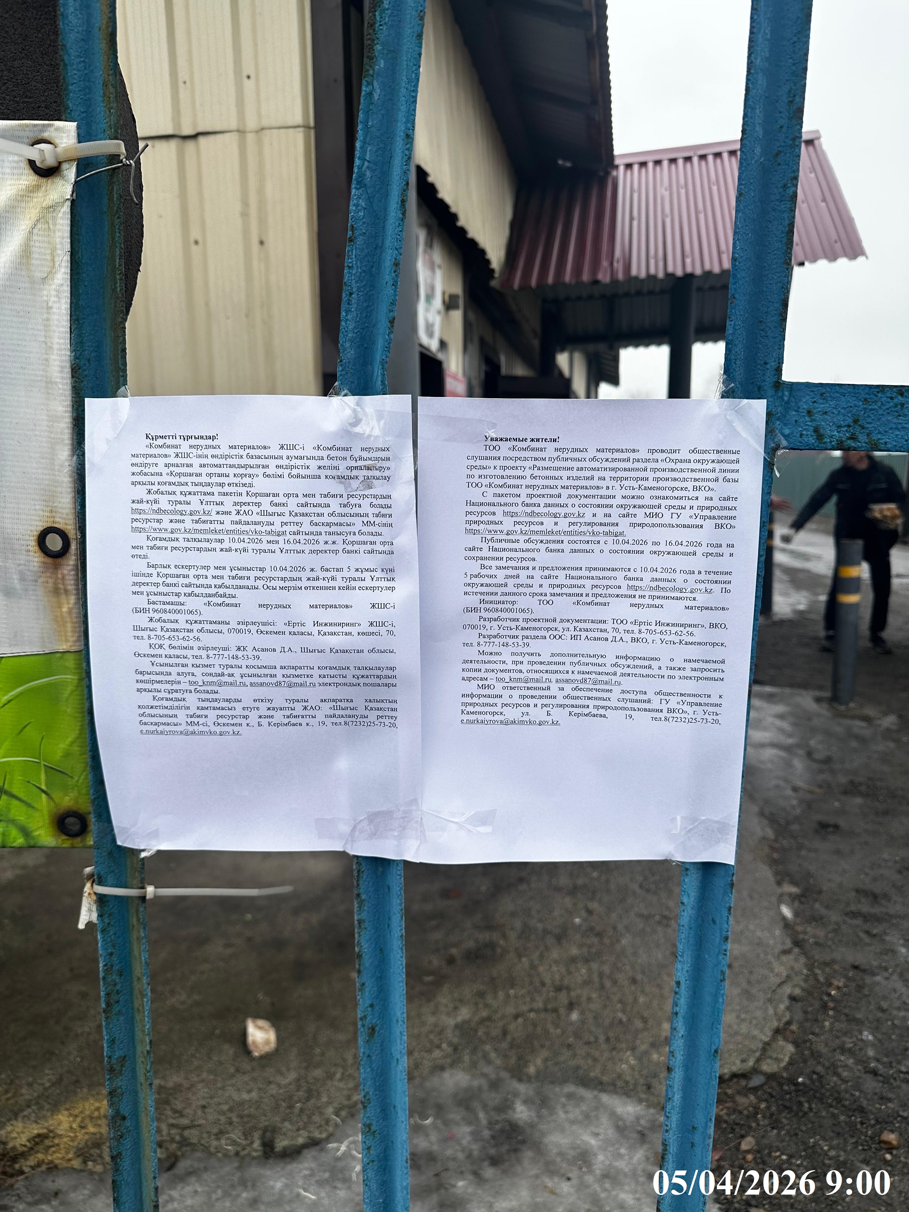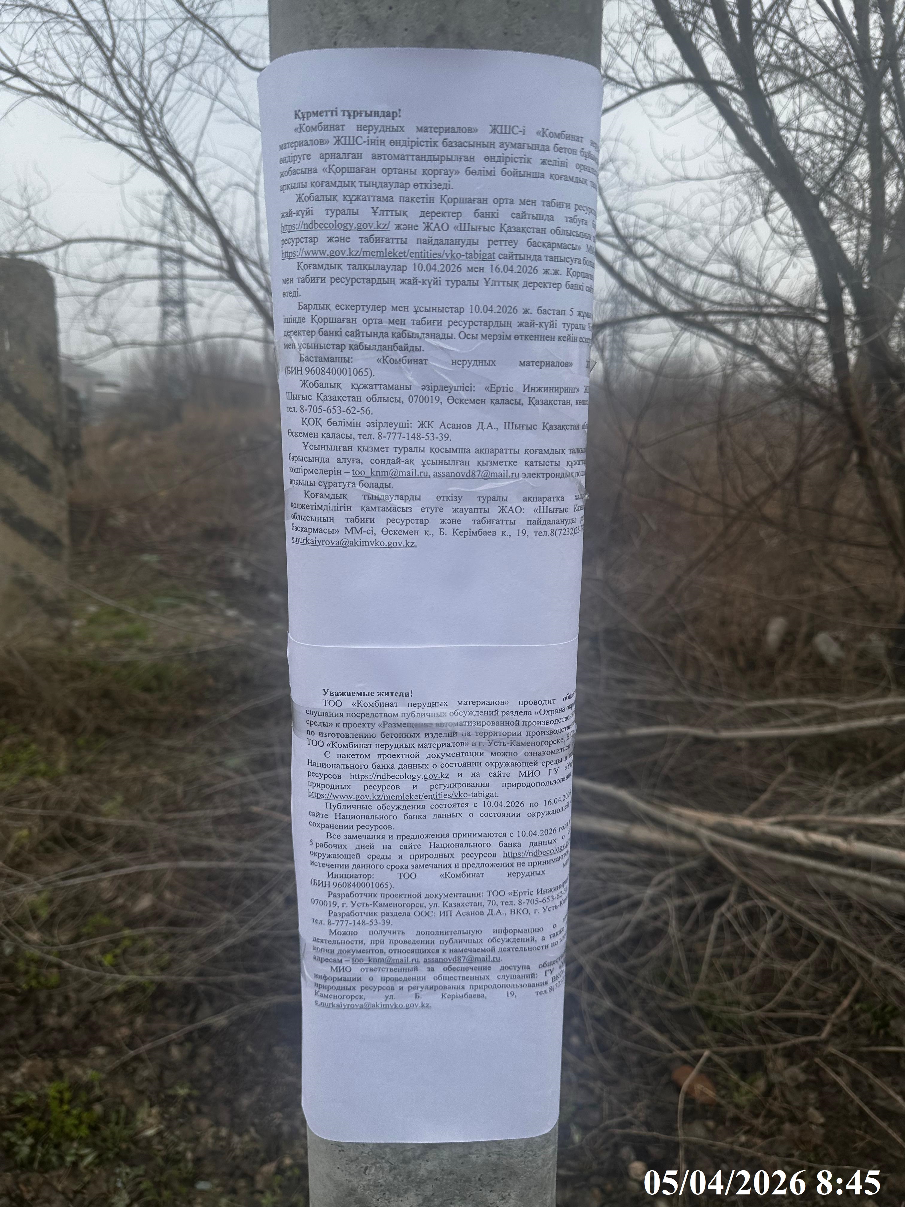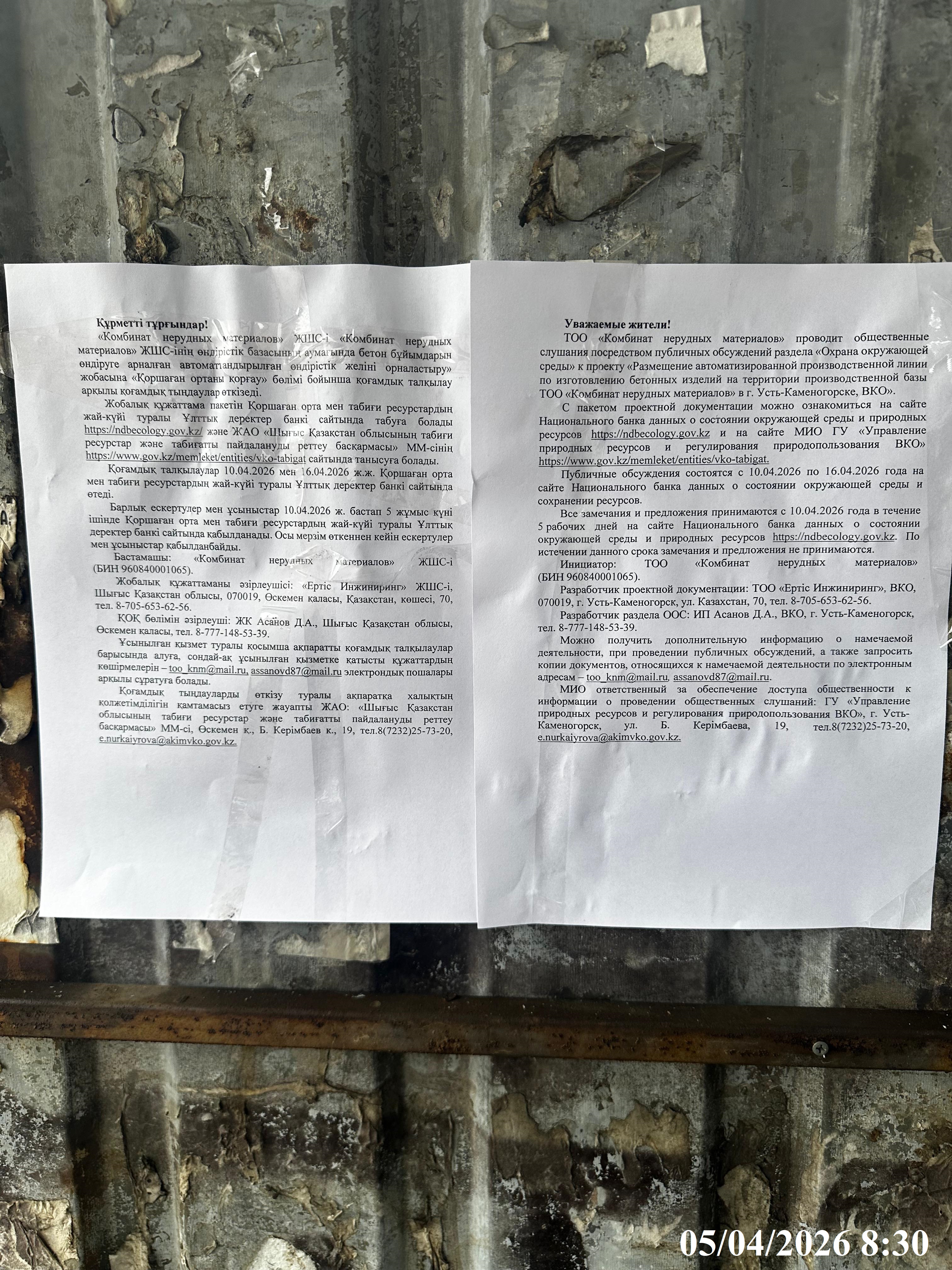По проекту: «Размещение автоматизированной производственной линии по изготовлению бетонных изделий на территории производственной базы ТОО «Комбинат нерудных материалов» в г. Усть-Каменогорске, ВКО»