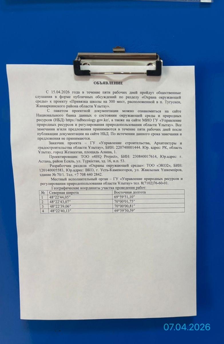 По проекту: «Привязка школы на 300 мест, расположенной в п. Тугускен, Жанааркинского района области Ұлытау».