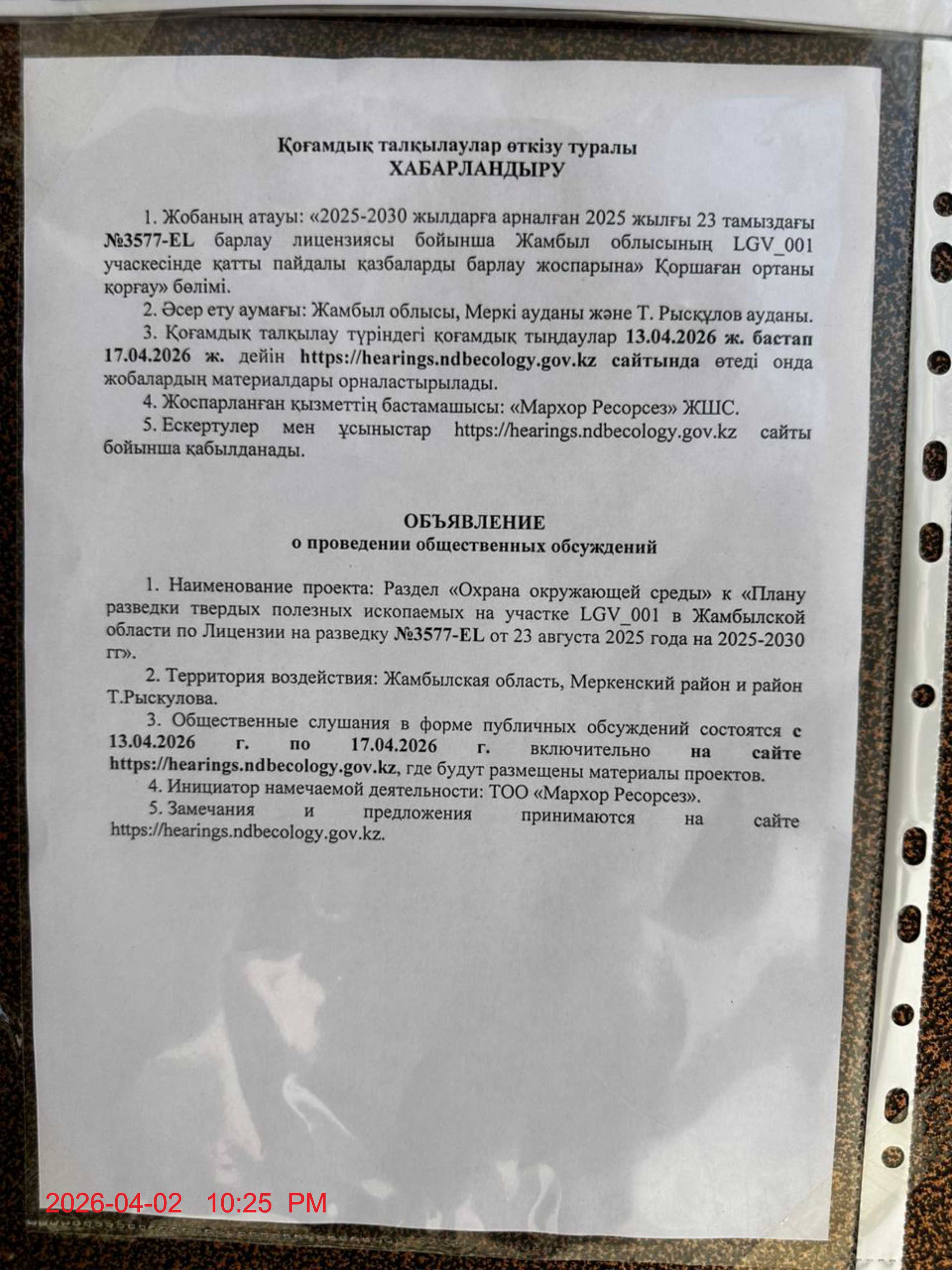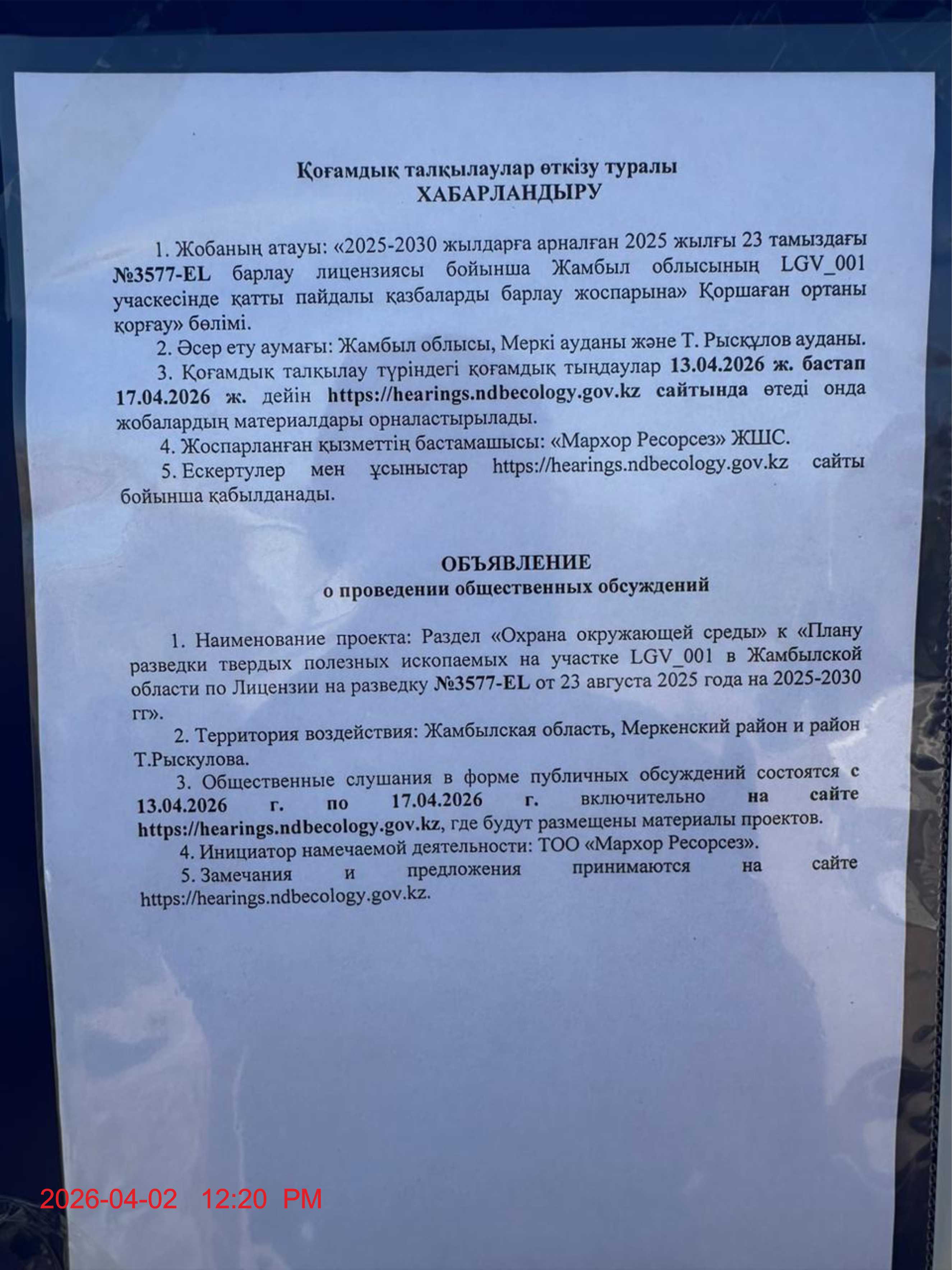По проекту: Раздел «Охрана окружающей среды» к «Плану разведки твёрдых полезные ископаемых на участке LGV_001 в Жамбылской области по Лицензии на разведку №3577-EL от 23 августа 2025 года на 2025-2030 гг.»