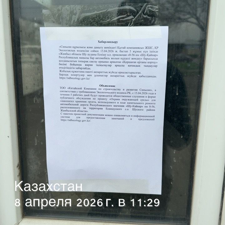 По проекту: «Охрана окружающей среды» для «накопител хранения грунта, используемого в ходе капитального ремонта автомобильной дороги Республиканского значения «Шу-Кайнар» км 0-56, расположенного на территории Ескишуского с.о. Шуского района Жамбылской области»