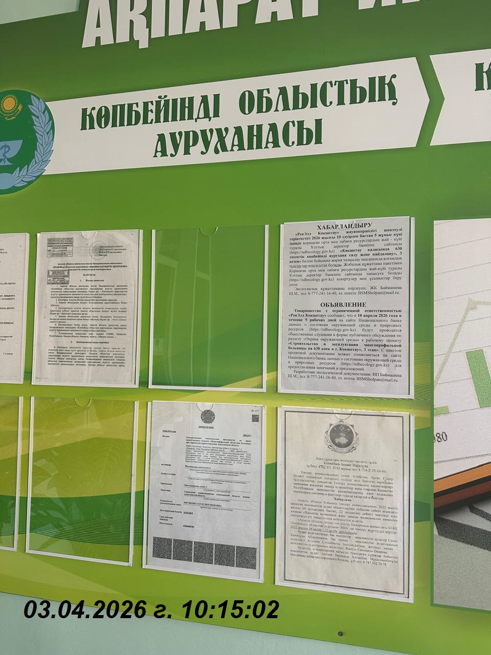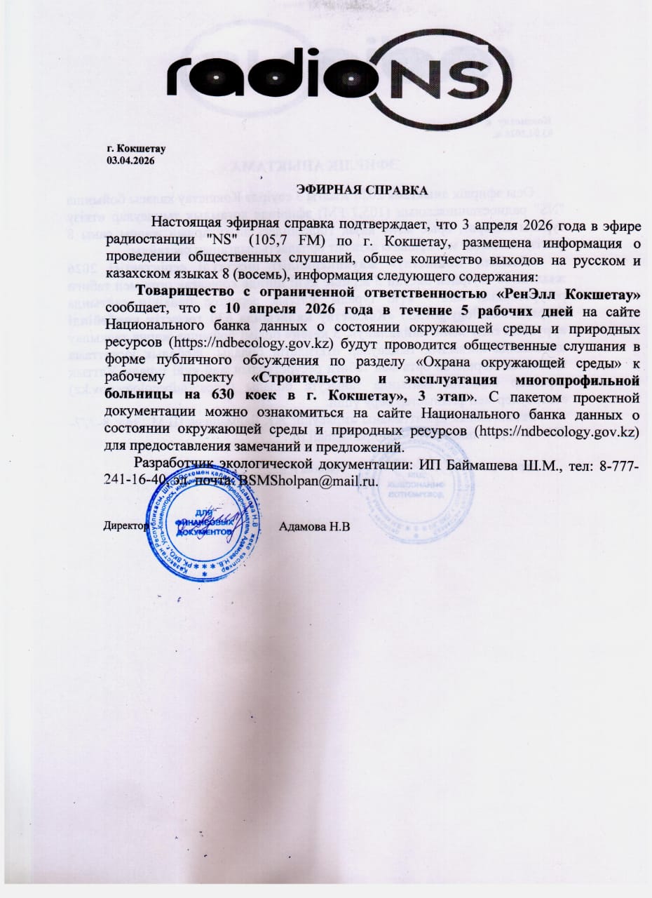 По проекту: Раздел "Охрана окружающей среды" к рабочему проекту "Строительство и эксплуатация многопрофильной больница на 630 коек в г.Кокшетау. 3 этап"