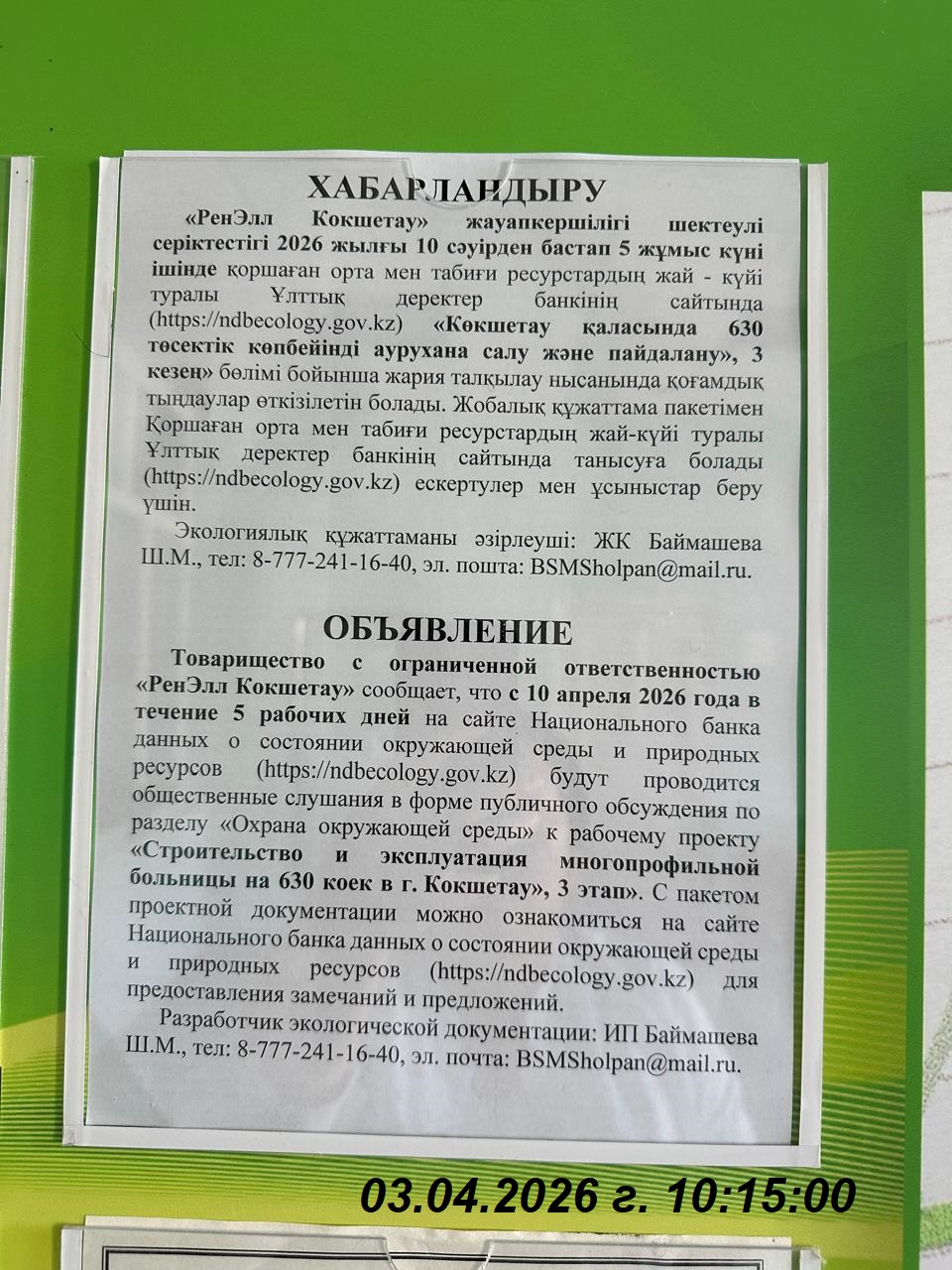 1.2. Представитель: Баймашева Шолпан (эколог)