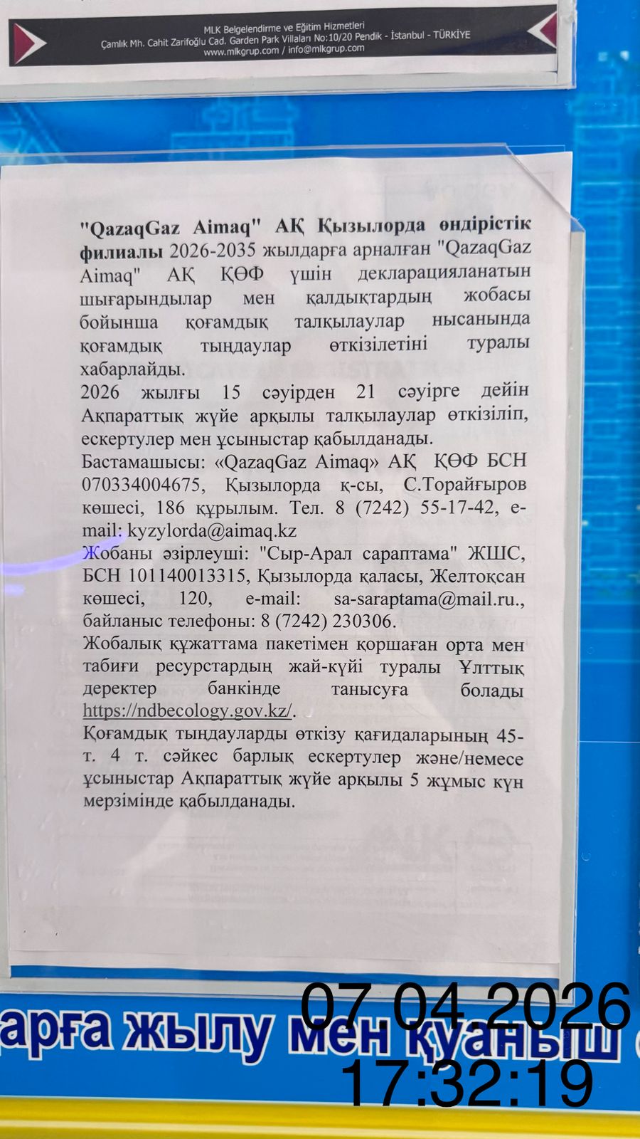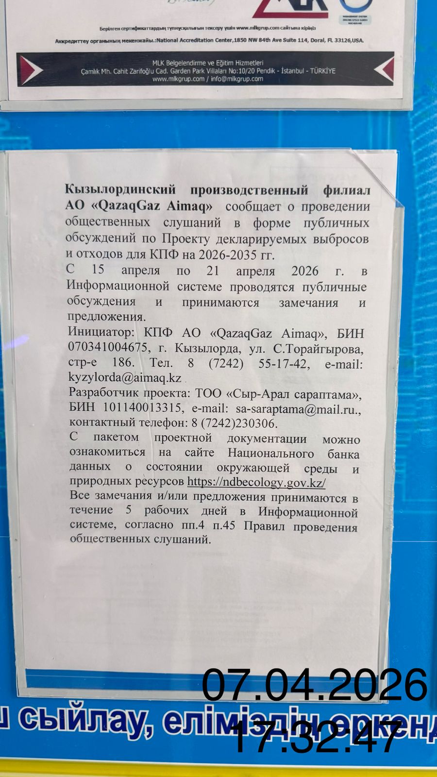 По проекту: Проект декларируемых выбросов и отходов для Кызылординского производственного филиала на 2026-2035 гг.