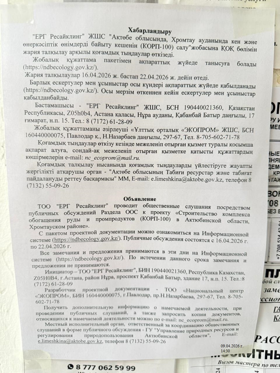 1.3. Контакты:alibek.mussin@erg.kz; ;