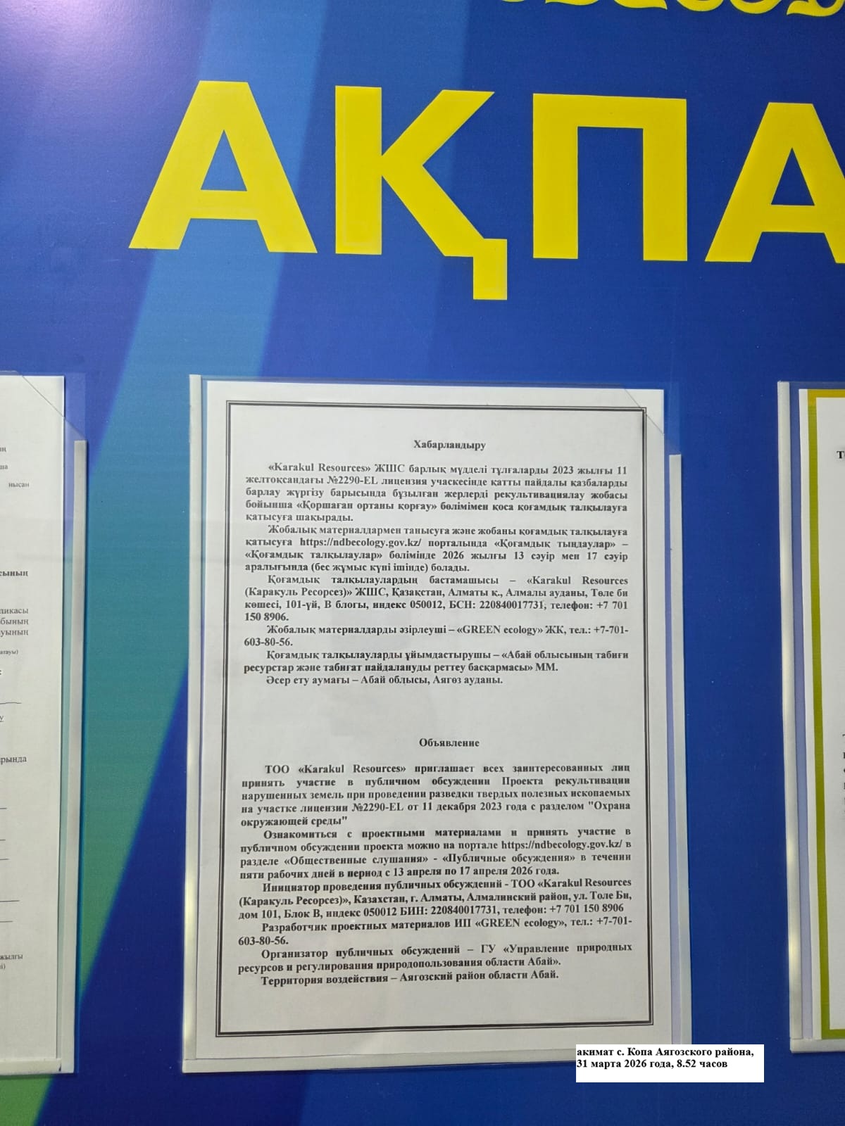 1. Инициатор: Товарищество с ограниченной ответственностью ""Karakul Resources (Каракуль Ресорсез)""